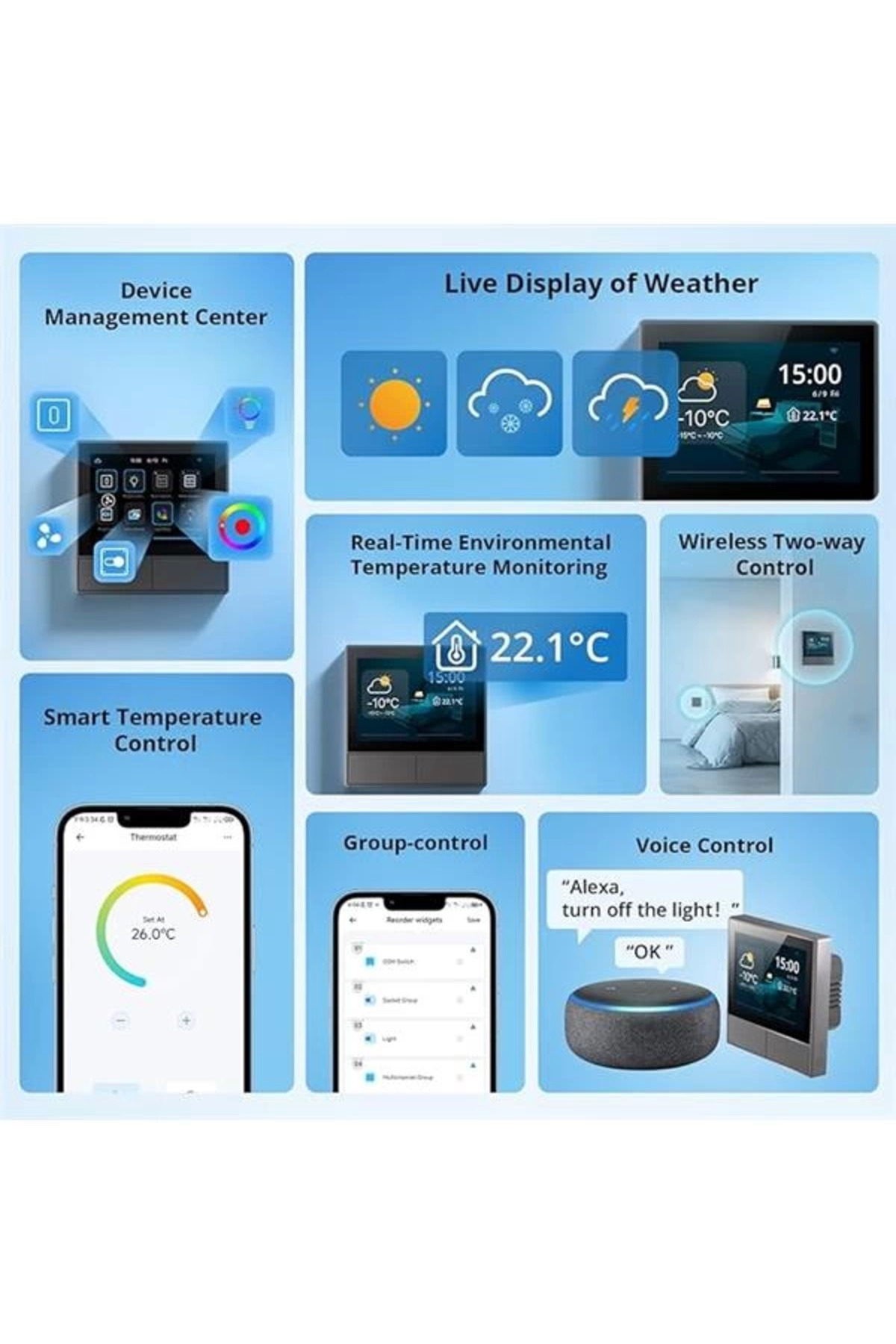 Hepsi Bir Arada Kontrol Merkezi NSPanel tek dokunuşla farklı sahnelerde belirli sahne modlarını kullanmanıza yardımcı olabilir Senaryo tabanlı kontrole ek olarak neredeyse tüm cihazları ve kontrol grubunun merkezi kontrol fonksiyonu ile uyumludur Entegre HMI Paneli NSPanel HMI kontrolü akıllı sıcaklık kontrolü ve akıllı duvar anahtarını merkezi olarak entegre ederek evinizi kullanışlı ve akıllı bir yere dönüştürür Ev Otomasyon Termostatı Dahili güçlü bir termostat ile farklı iç ortam sıcaklıklarını farklı süreler için ayarlayabilirsiniz ve NSPanel odayı rahat bir sıcaklıkta tutmak için ayar koşullarınıza göre ısıtma veya soğutma ekipmanını otomatik olarak tetikler