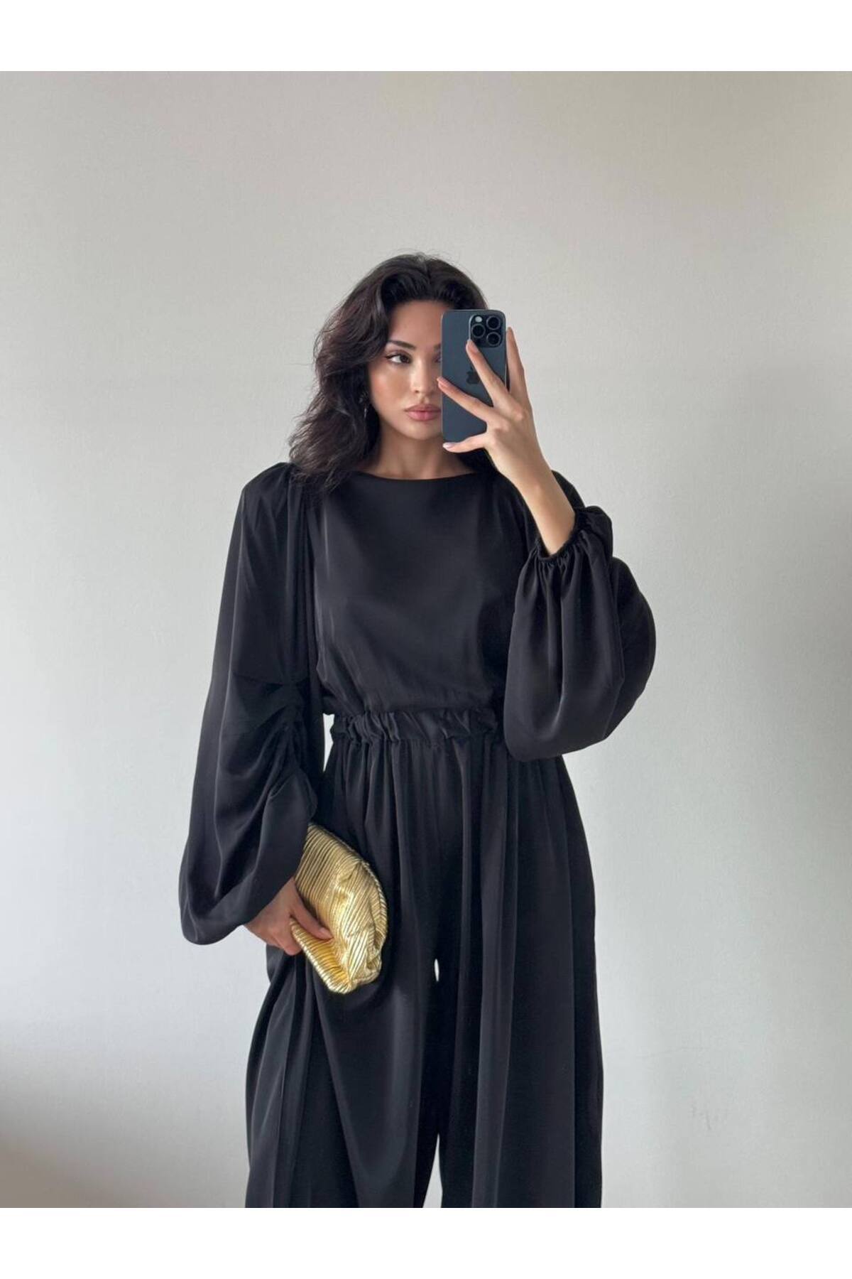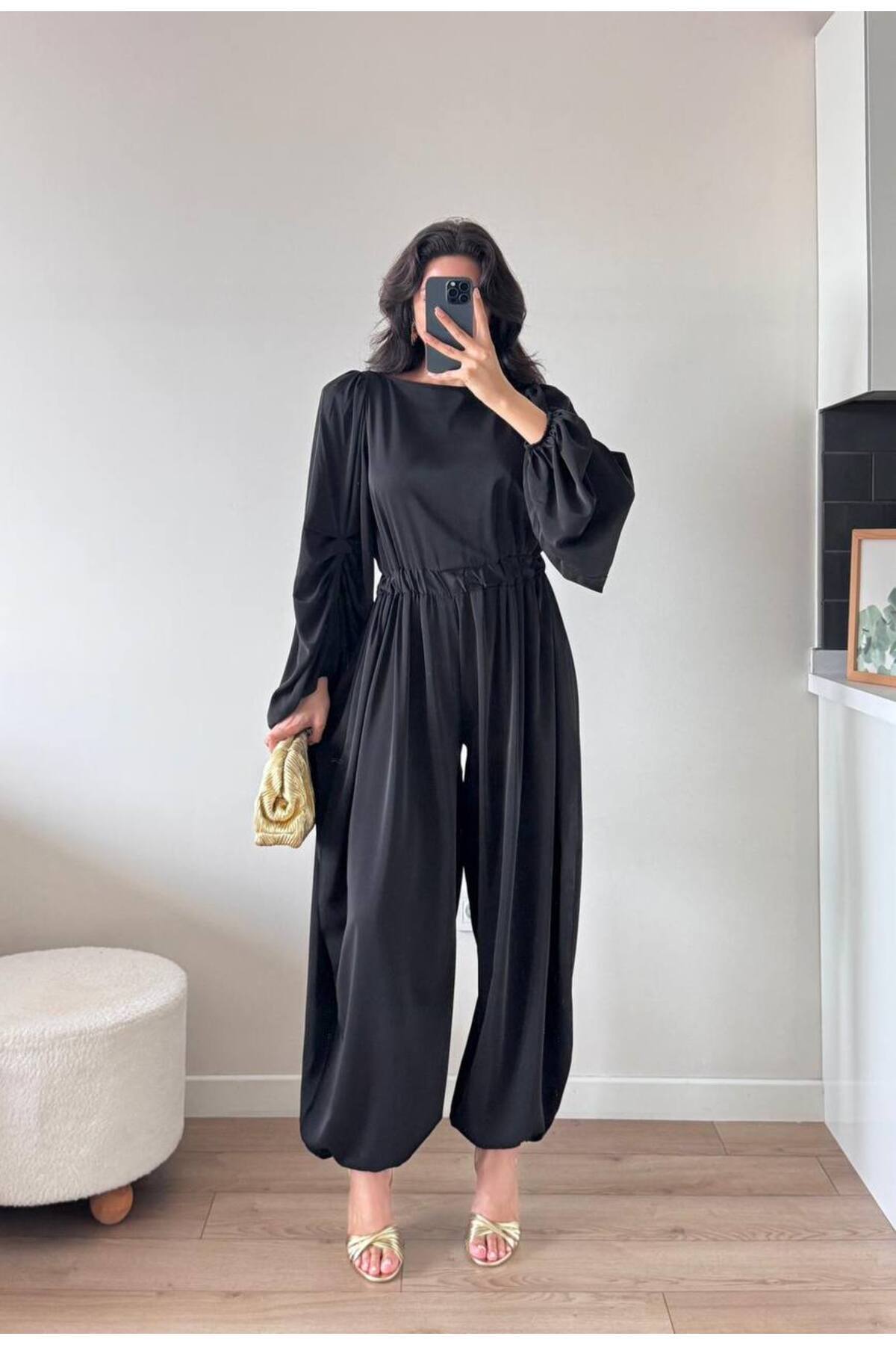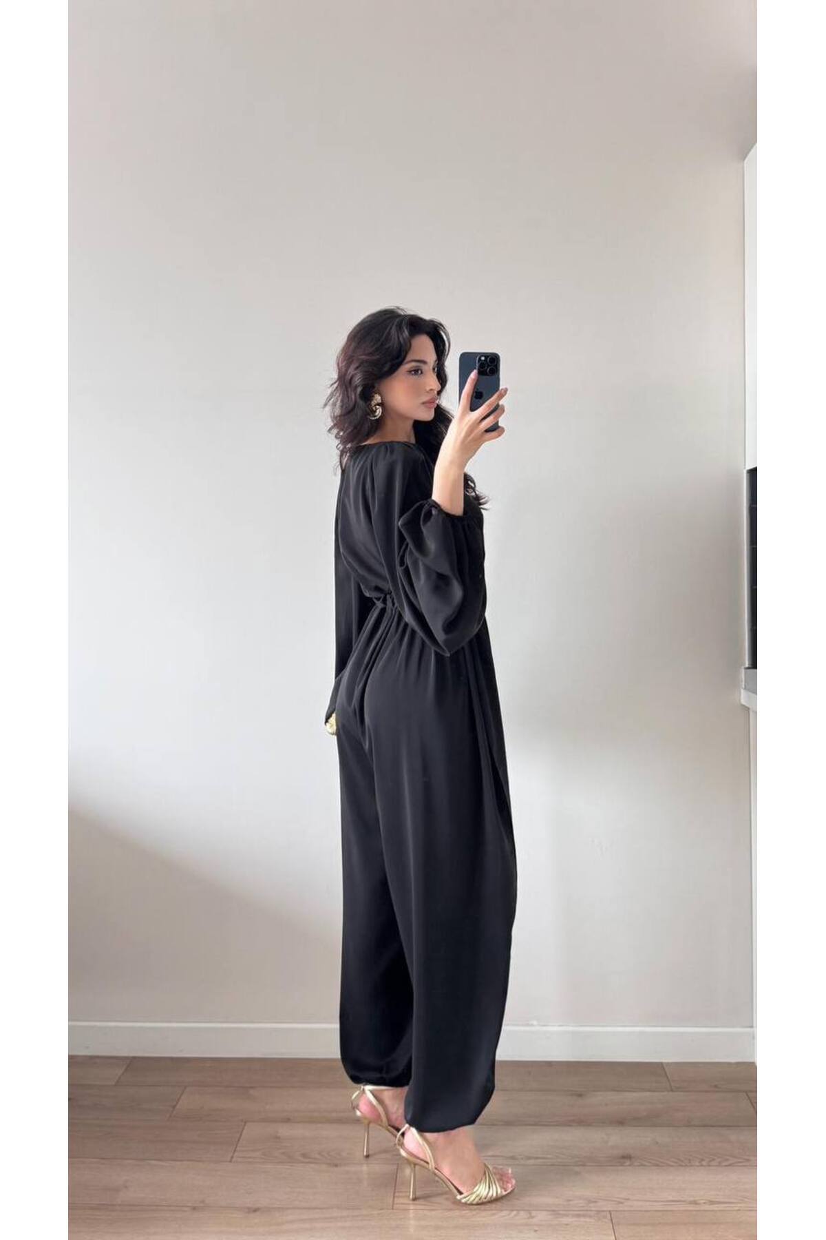 Rahat kesimi ile gün boyu konfor sunan, pileli kollar ve büzgülü bel detaylarıyla şıklığı ön plana çıkaran siyah maxi tulum.
