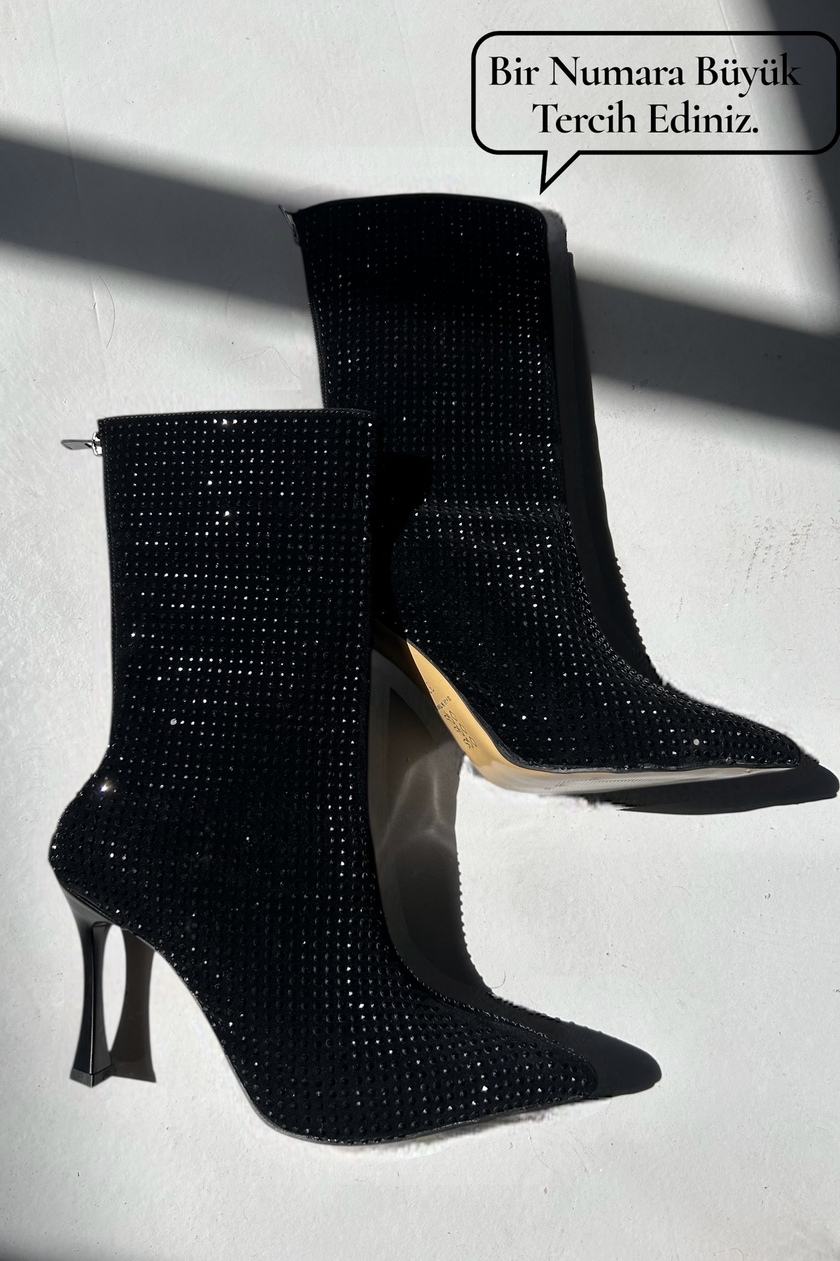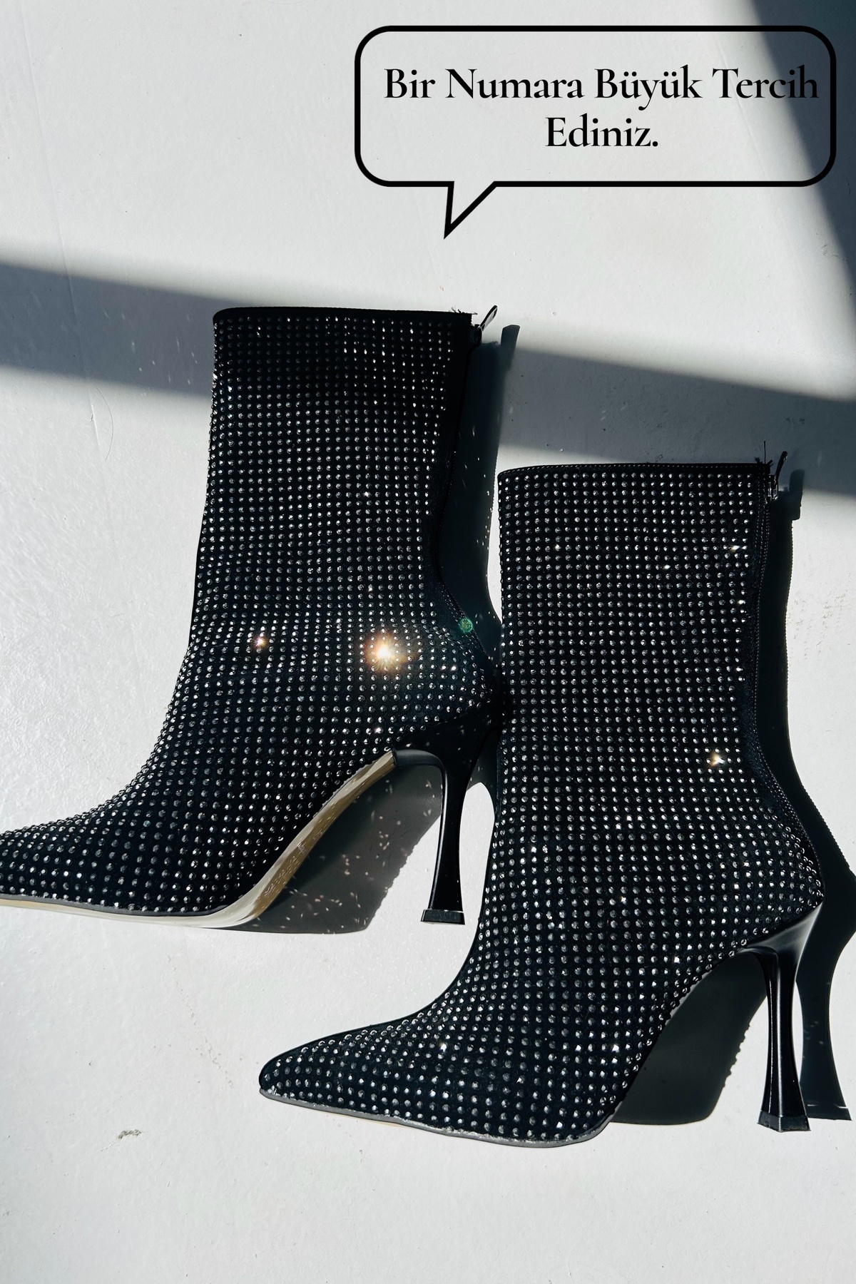 - Siyah taş detaylı yüksek topuklu kadın bot, şıklığı ve rahatlığı bir arada sunar.