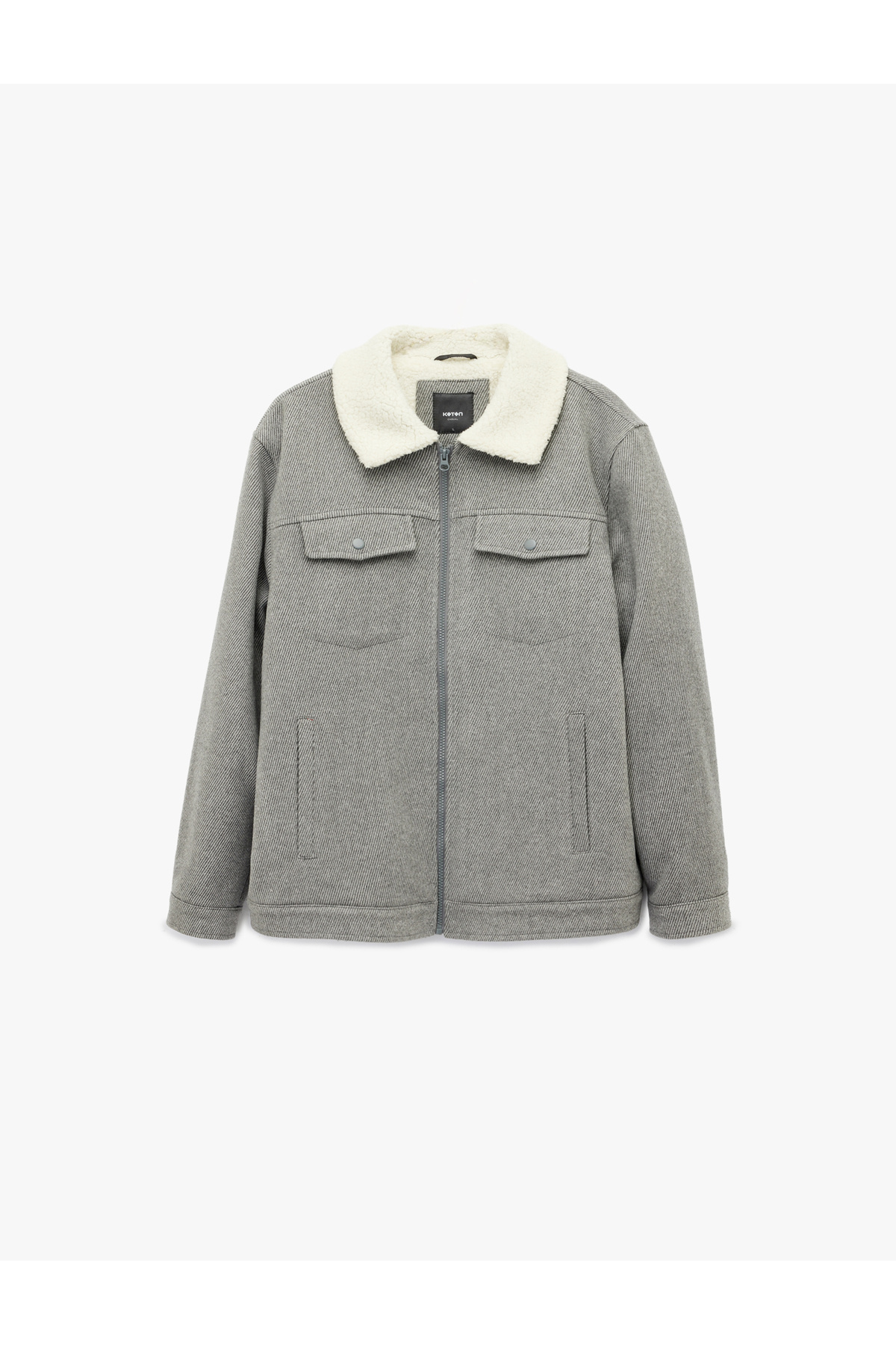 Uzun Kollu Cepli Fermuarlı İçi Peluş Astarlı Yakası Suni Kürklü Kaşe Mont