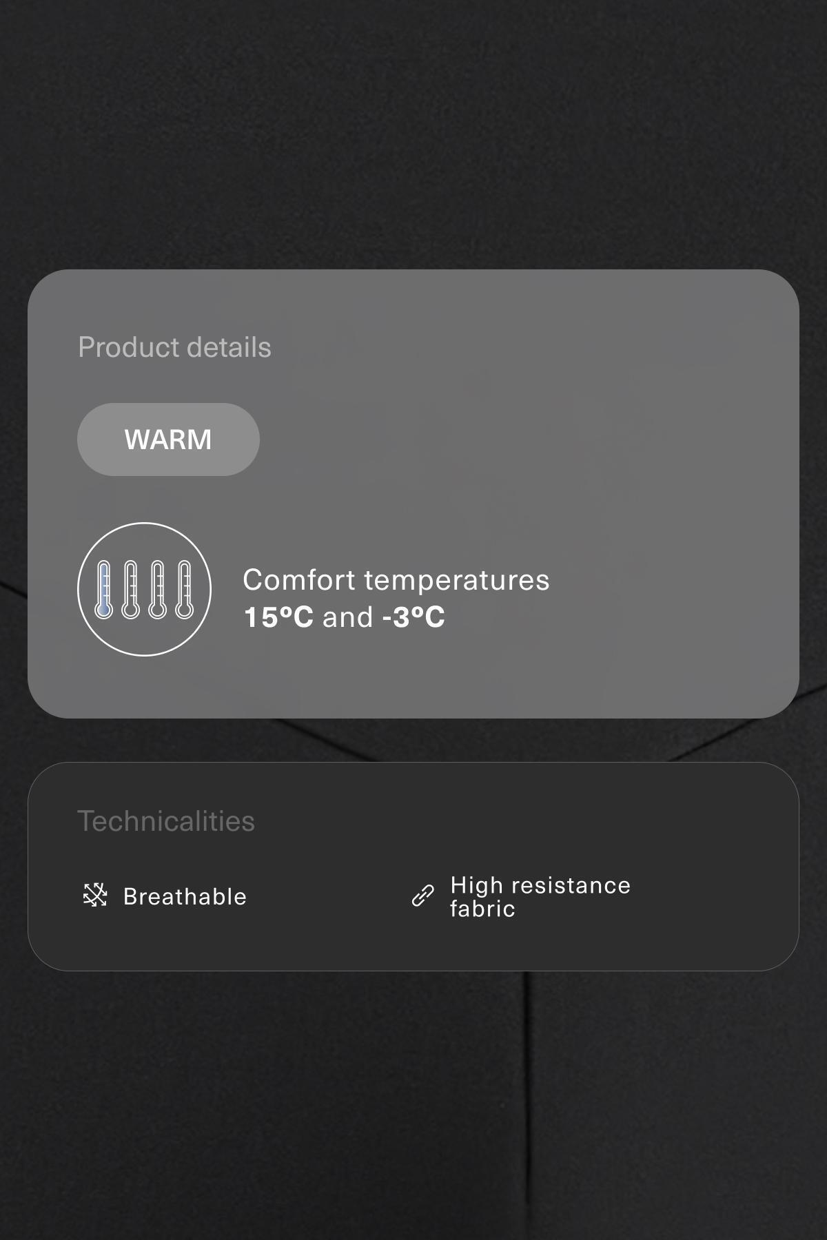 Bu giysi, ceket, uzun kollu ve yüksek yakalı bir T-shirt, iç çamaşırı, çoraplar, ayakkabı, eldiven ve örgü bir bere giyerek 0,4 m/s simüle edilmiş rüzgarla yapılan ileri düzey bir test sırasında +15ºC (düşük aktivite) ila -3ºC (orta düzeyde aktivite) sıcaklıklarına dayanacak şekilde sertifikalandırılmıştır.
