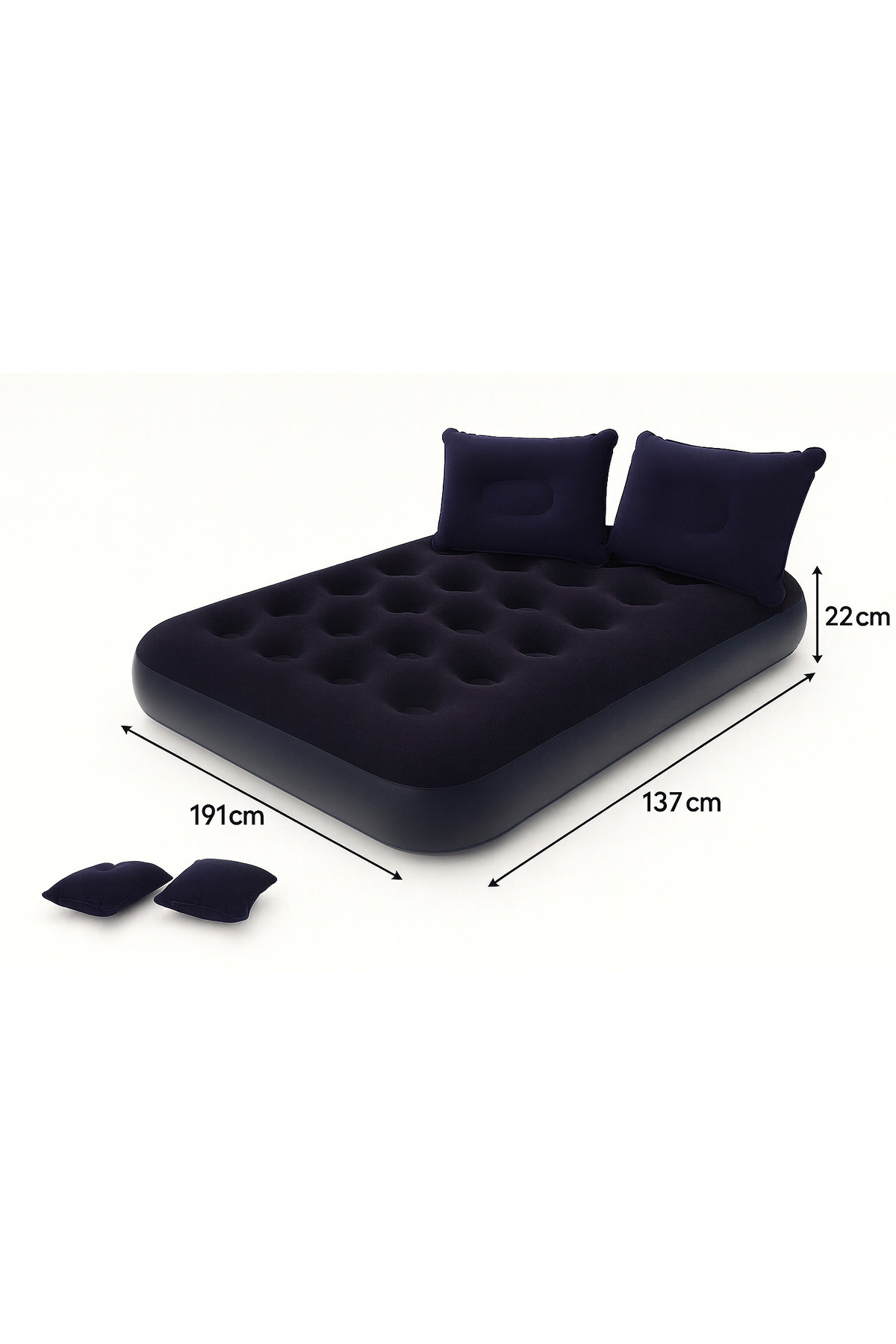 •Çift kişilik geniş kullanım alanı (191x137x22 cm)•200 kg’a kadar taşıma kapasitesi•2’si 1 arada valf sistemi ile kolay şişirme & indirme•2 adet şişme yastık hediyeli•Kamp, ev ve misafirler için ideal kullanım•Dayanıklı flocked üst yüzey ile ekstra konfor