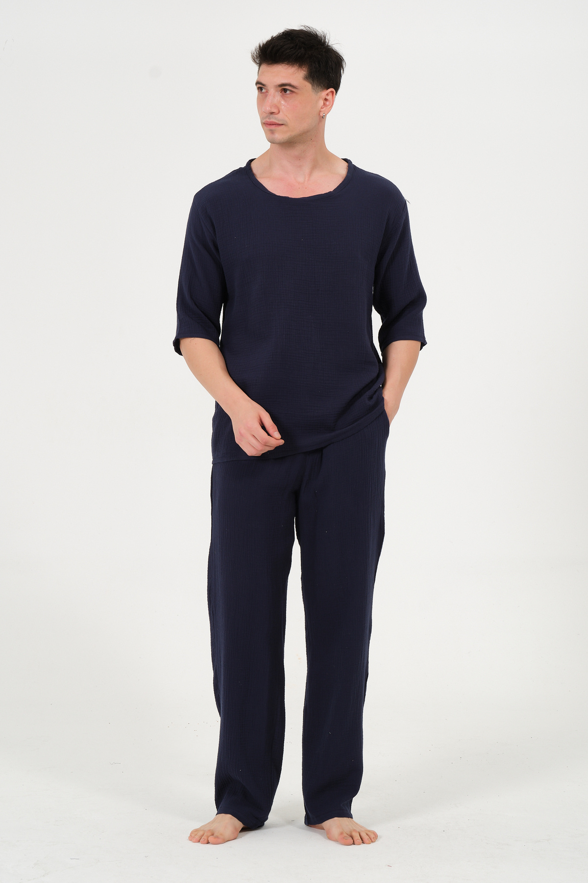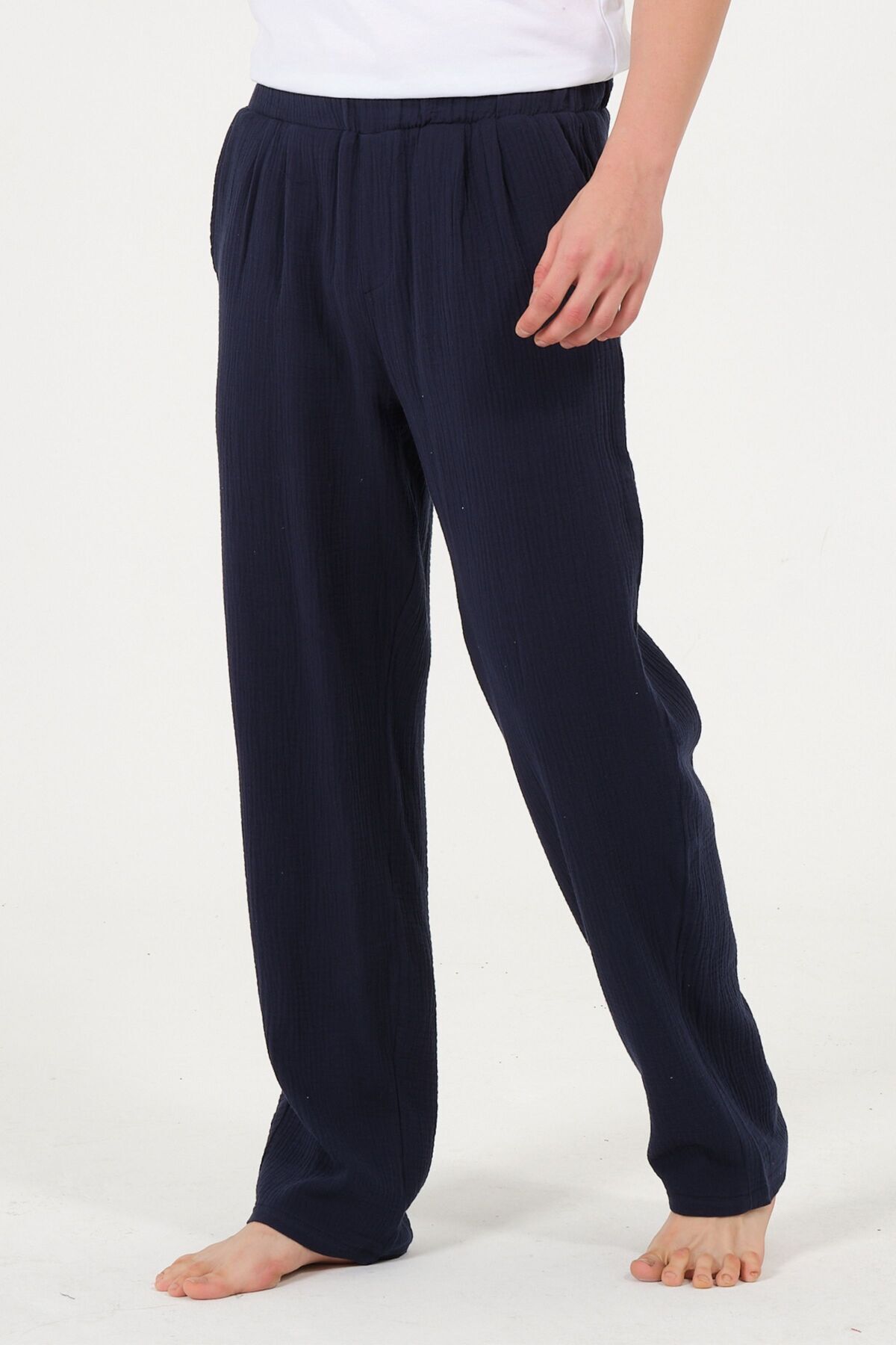 Hem ev şıklığını önemseyen hem de günlük yaşamında özgün ve rahat parçalar arayanlar için tasarlanan bu müslin pantolon, konforlu yaşamın lüks dokunuşu olarak öne çıkıyor.