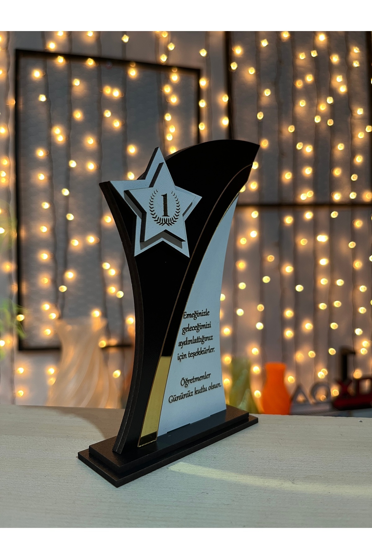Öğretmenler Günü Hediyesi, Masaüstü Dekoratif Ödül, Lazer Yazılı MDF ve Gold Pleksi Plaket