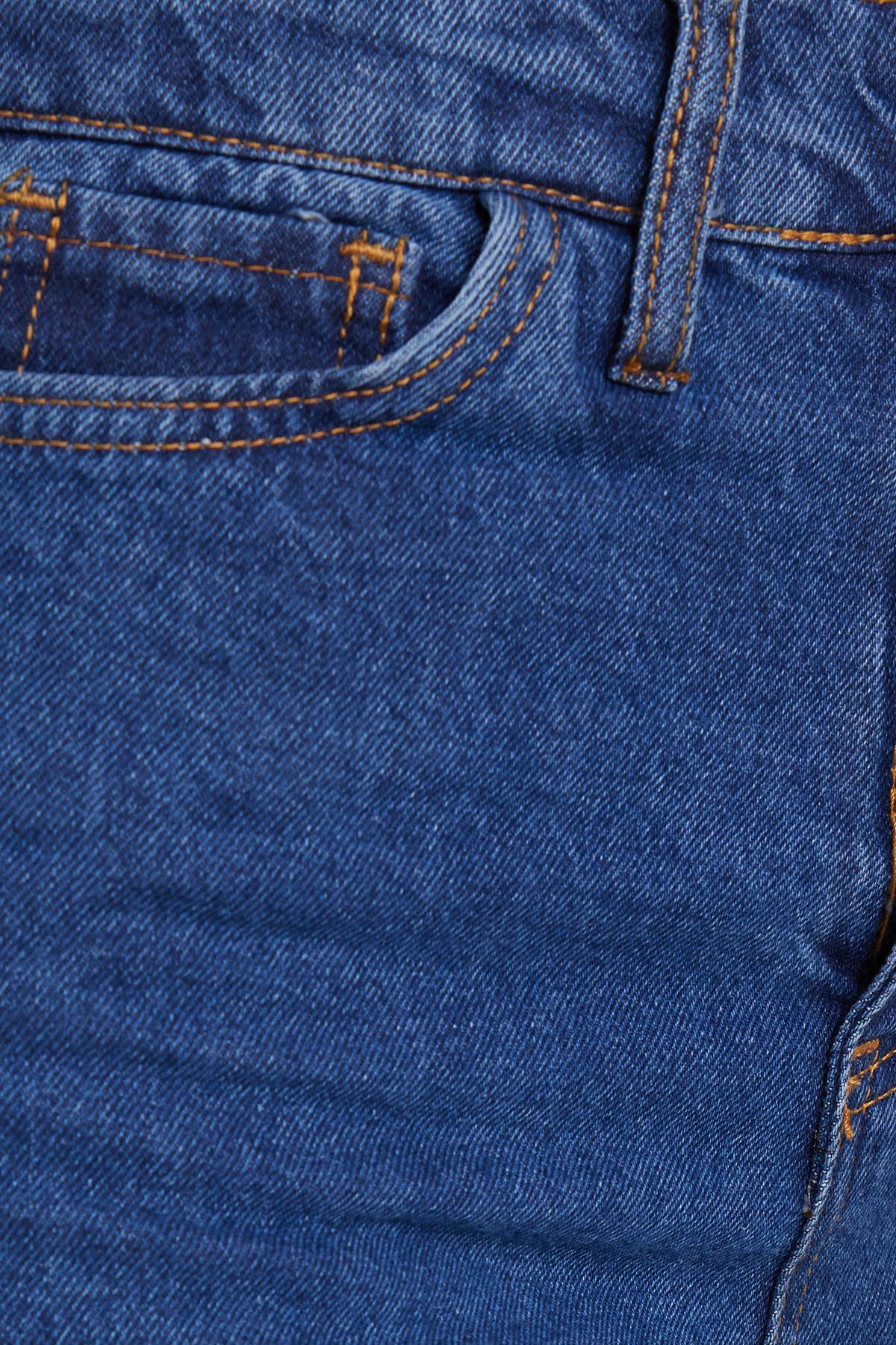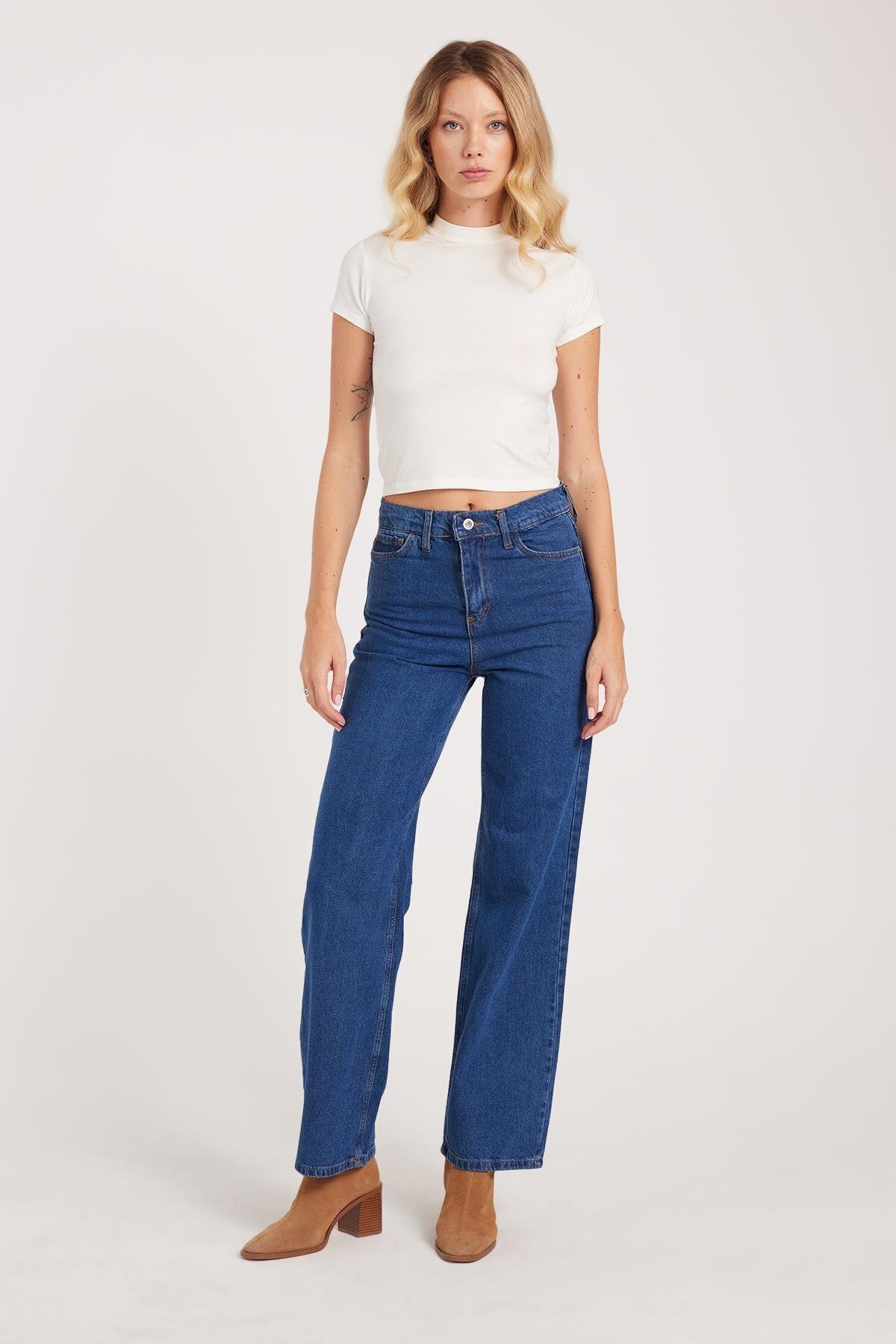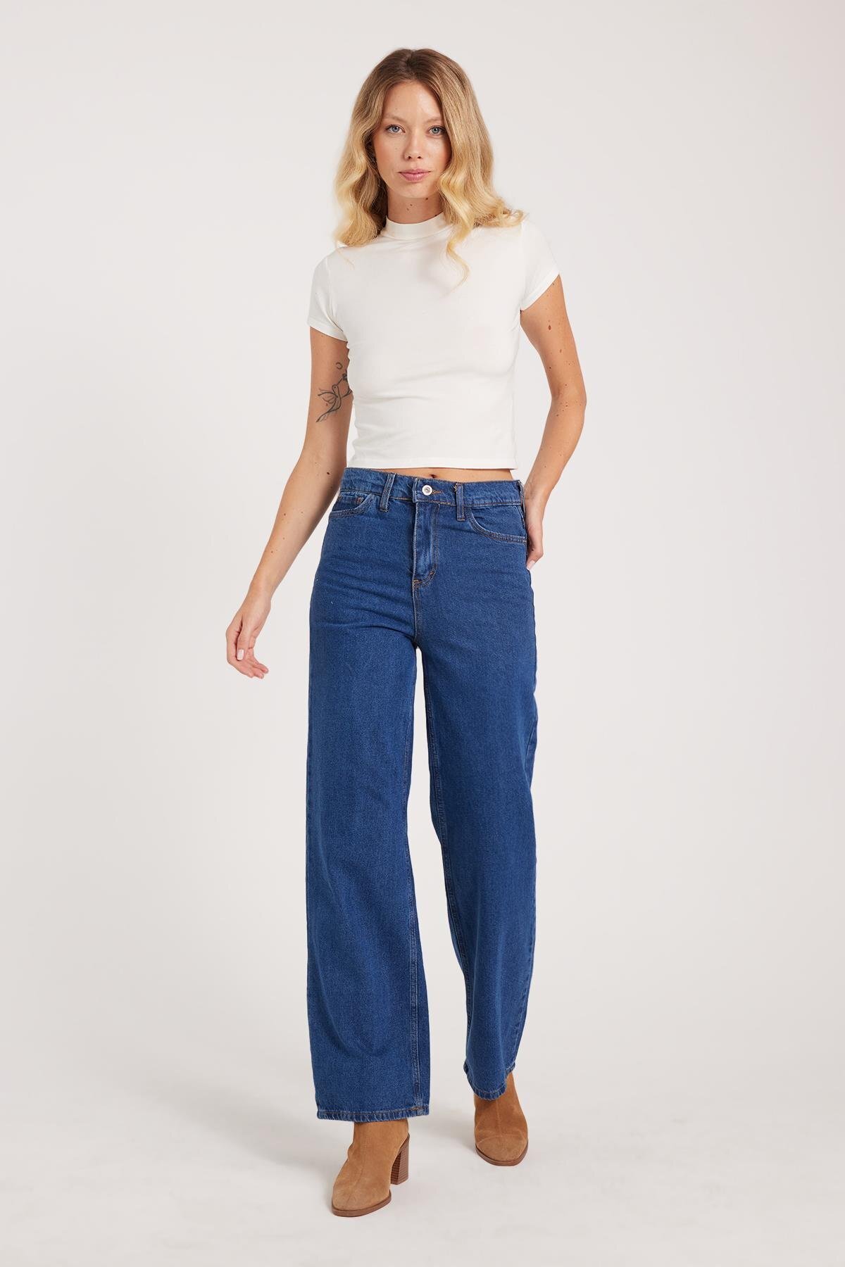 Kadın Regular Fit Klasik Kesim Pamuklu Bol Paça Koyu Mavi Jean Pantolon