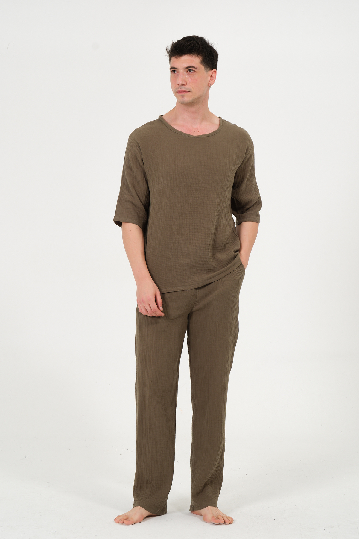 Hem ev şıklığını önemseyen hem de günlük yaşamında özgün ve rahat parçalar arayanlar için tasarlanan bu müslin pantolon, konforlu yaşamın lüks dokunuşu olarak öne çıkıyor.