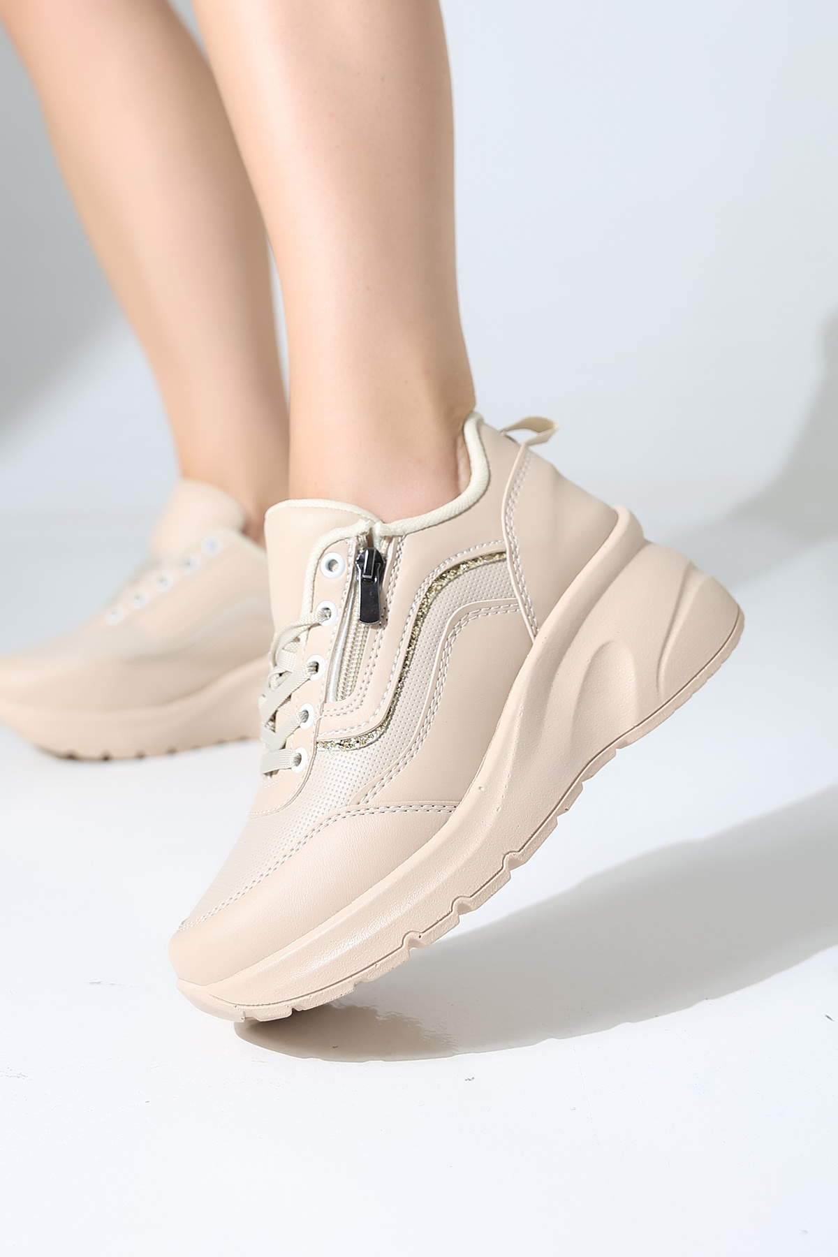 - Dolgu topuklu tasarımıyla orta topuk boyu (6,5 cm), hem konfor hem de stil kazandırır.
