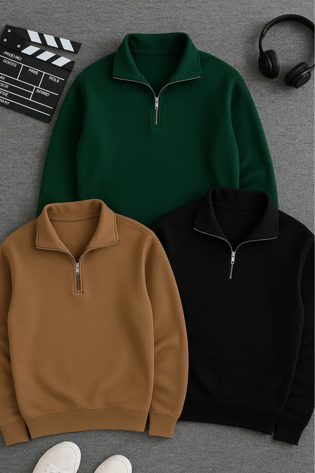 Erkek Yarım Fermuarlı Günlük Basic Salaş Kışlık Kalın Uzun Kollu Polo Yakalı Oversize 3'lü Paket Sweatshirt Bu erkek sweatshirtler, soğuk kışlık günler için özel olarak tasarlanmış, hem konforlu hem de modern parçalardır.