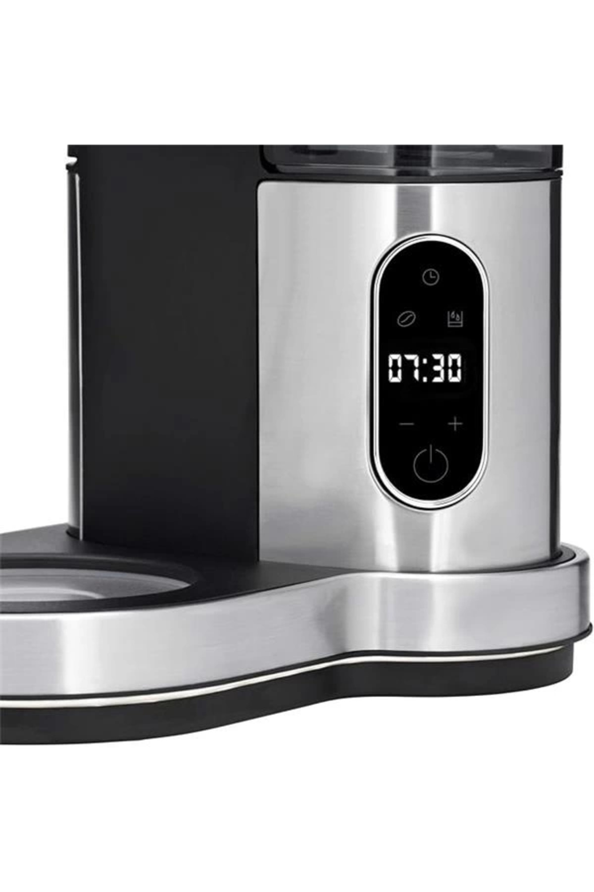 İçerik 1 x filtre kahve makinesi mat (33 x 212 x 38 cm 1000 W) cam sürahi (125 l) 10 fincan için demleme kapaklı damlama durdurma (kaynama sonrası damlama yok) ve taşma emniyeti Ürün numarası 0412320011 Isıtma plakası sayesinde sıcak tutma fonksiyonu Hazırlama tamamlandıktan sonra sıcak tutma fonksiyonu otomatik olarak etkinleştirilir Aroma Perfection Güçlü aromatik kahve için aroma fonksiyonu etkinleştirilebilir Zamanlayıcı fonksiyonu Su seviyesi göstergeli çıkarılabilir su tankı (BPA içermez) Dokunmatik fonksiyonlu kontrol paneli ve LED aydınlatmalı 180 döner filtre çıkarılabilir filtre (boyut 1 x 4) Otomatik kireç çözme programı sayesinde kolay temizleme Filtre ve demlik akan suyun altında temizlenebilir