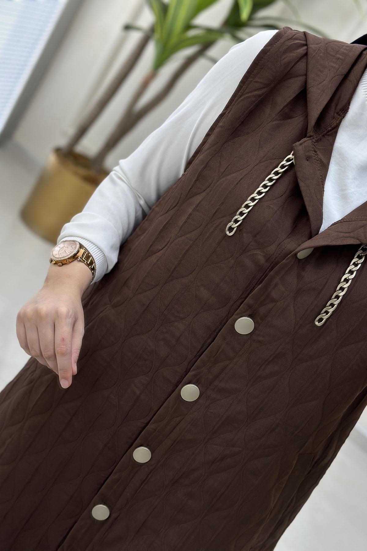 - Kahverengi tonlarındaki şık tasarımıyla her ortamda dikkat çeken kapitone yelek.