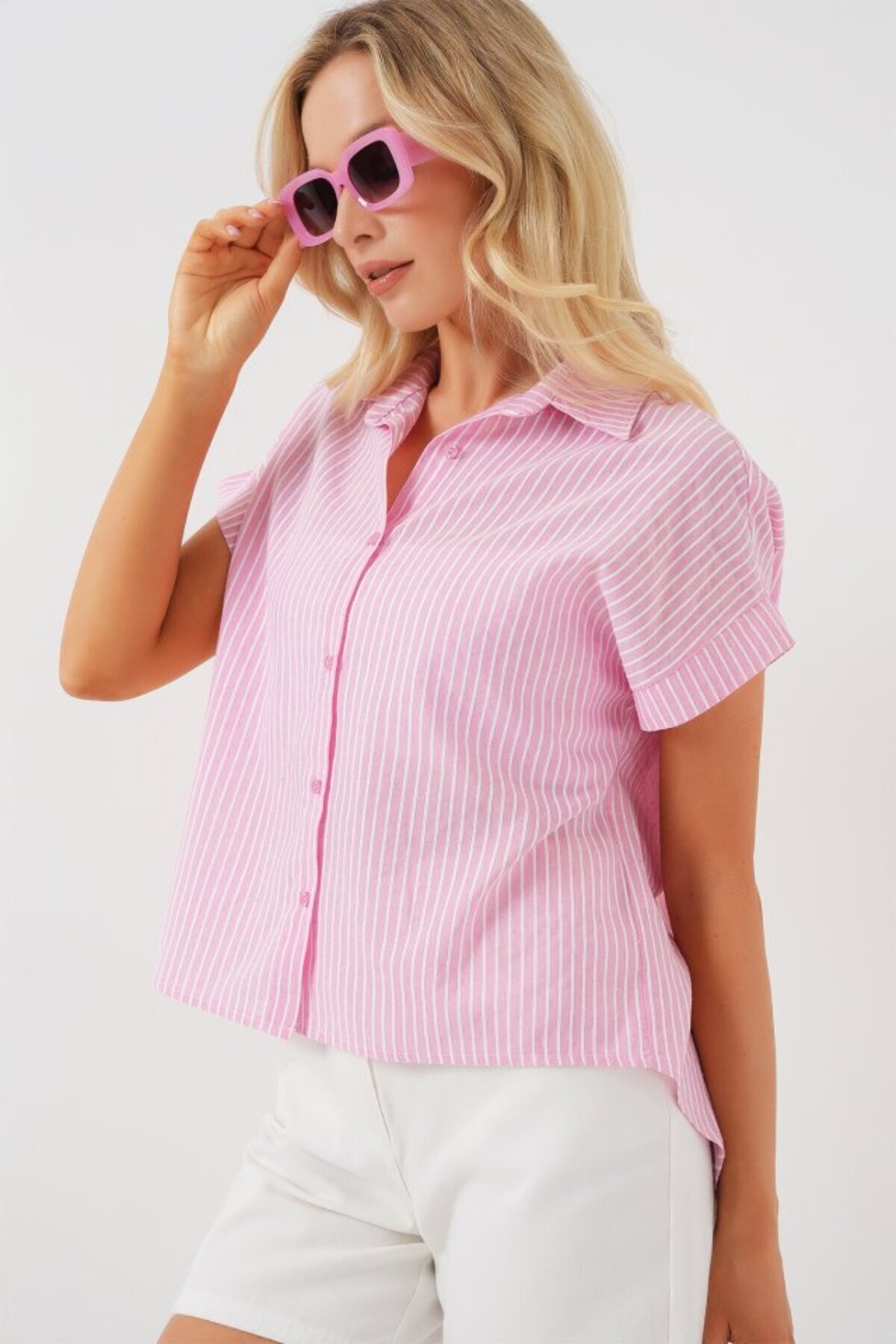 Çizgili Kısa Kol Gömlek 20324 - Pembe