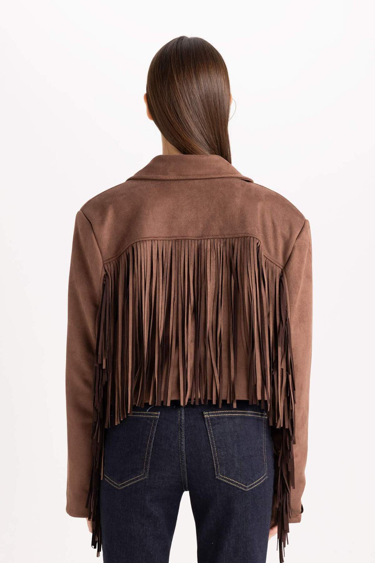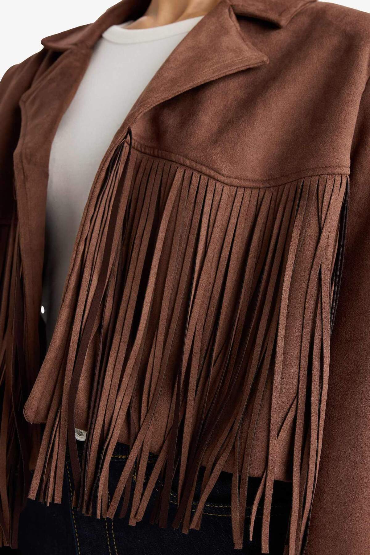 Zarif tafta kumaşı ve hareketli püskül detaylarıyla öne çıkan süet ceket, şıklığınızı tamamlayan özel bir parça.
