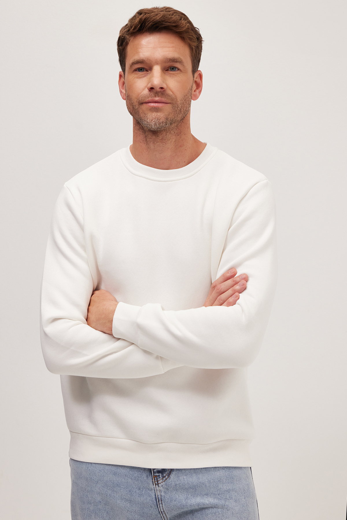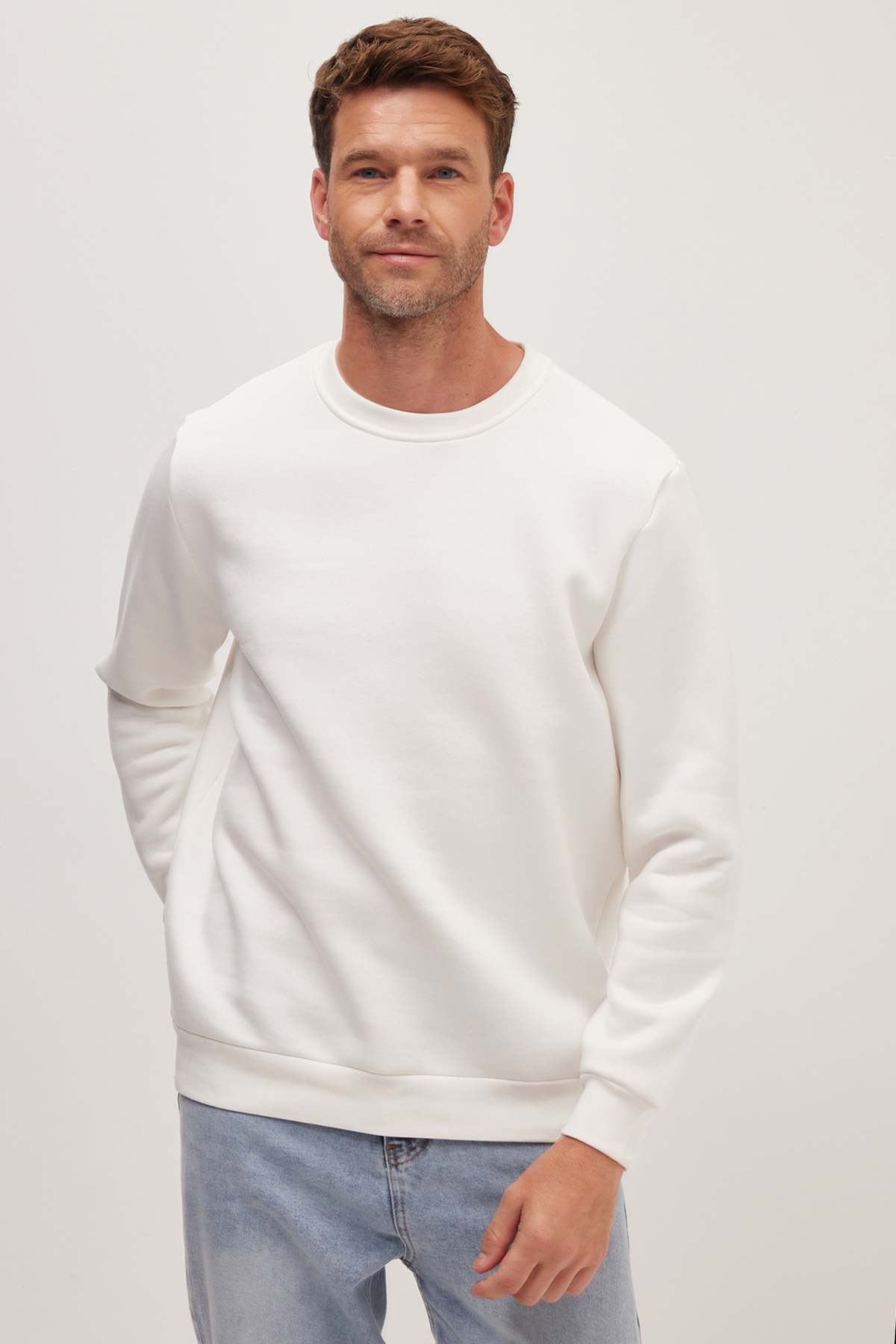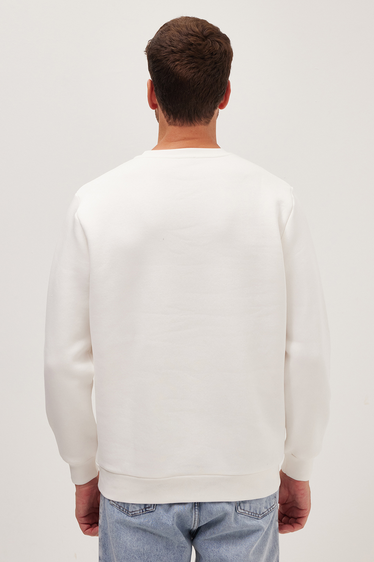 Unisex Relax Fit Rahat Kesim Pamuklu Yumuşak Dokulu İçi Polarlı Beyaz Bisiklet Yaka Sweatshirt