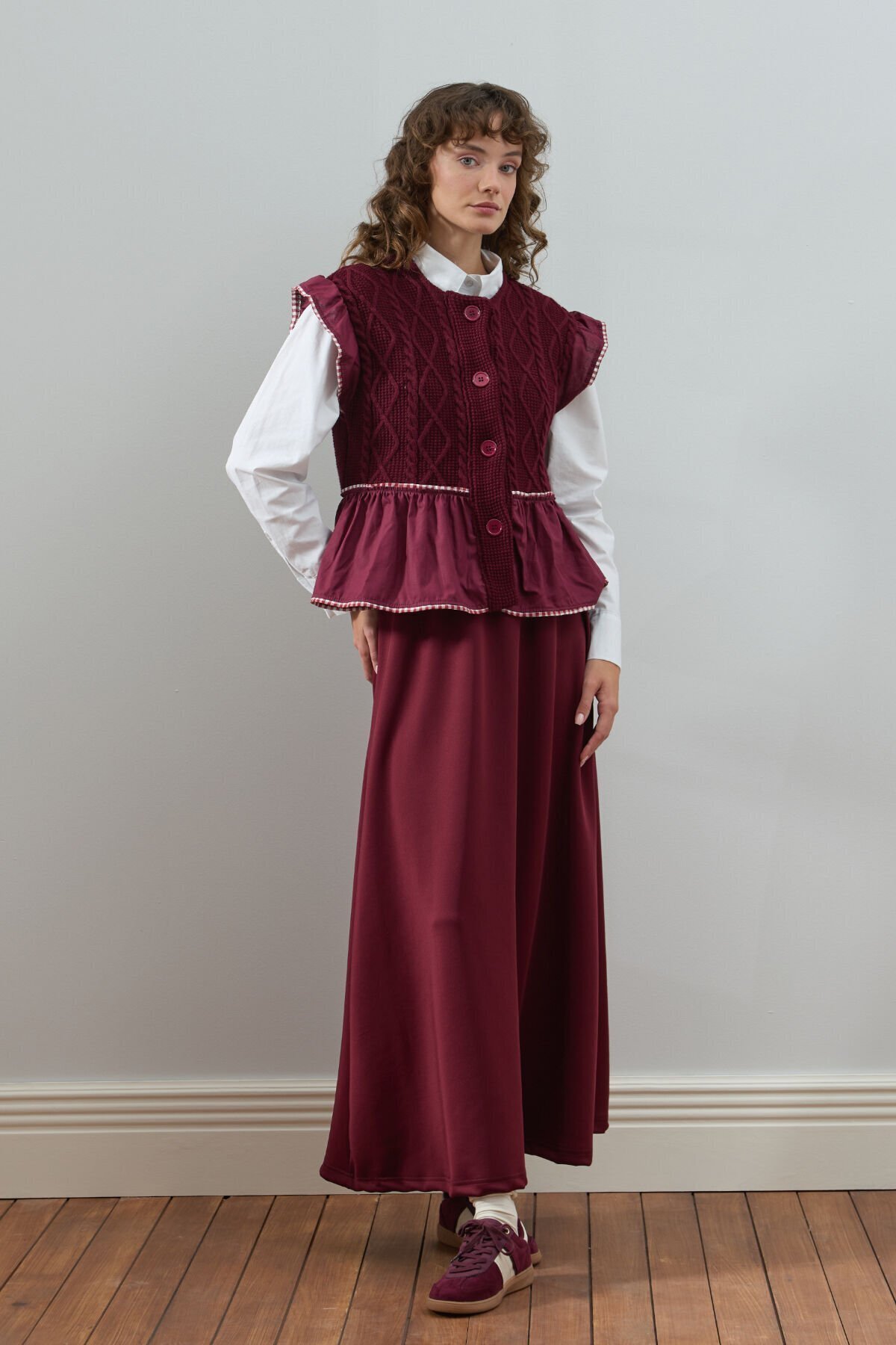Bu fırfırlı triko yelek, hem şık hem de rahat bir görünüm sunar.