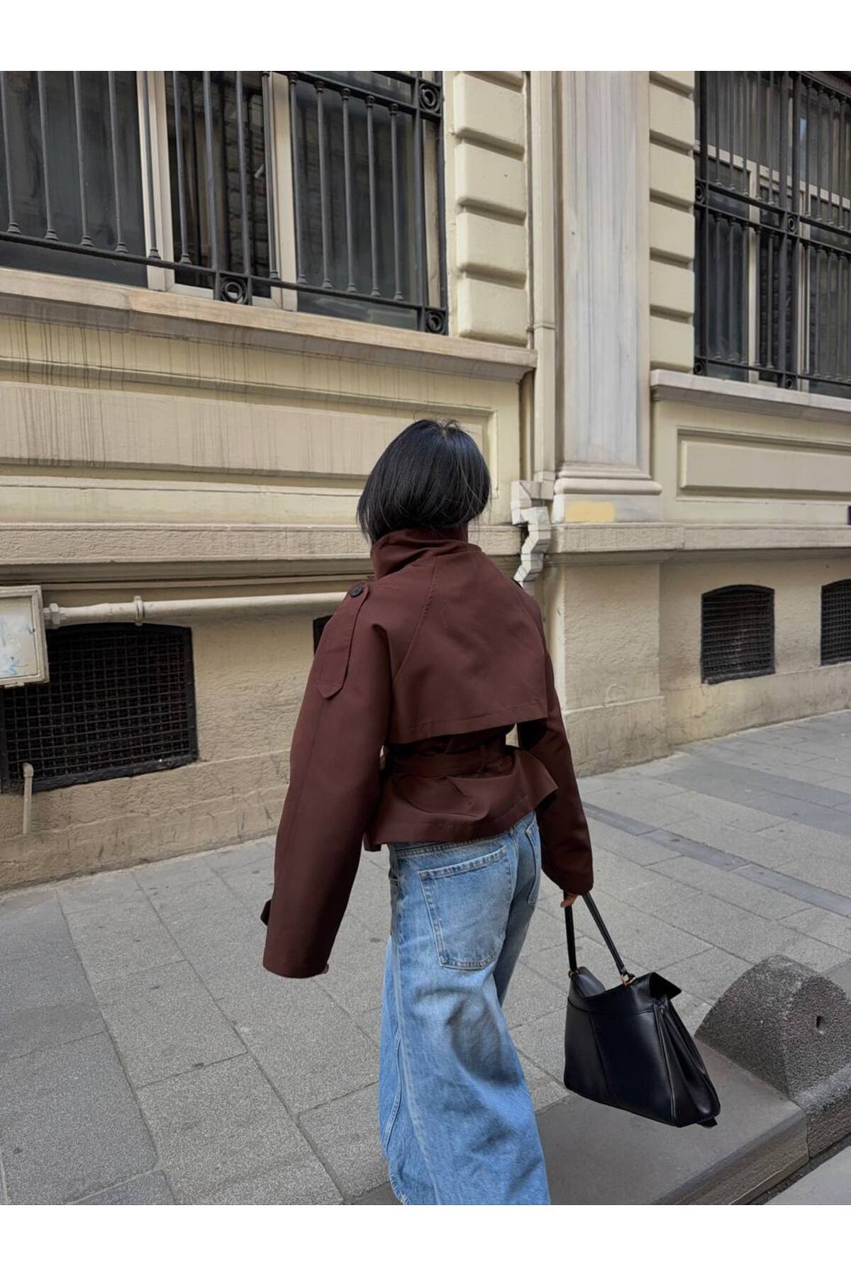 Kadın Siyah Kısa Trençkot – Kuşaklı Düğme Detaylı Mevsimlik Mont
