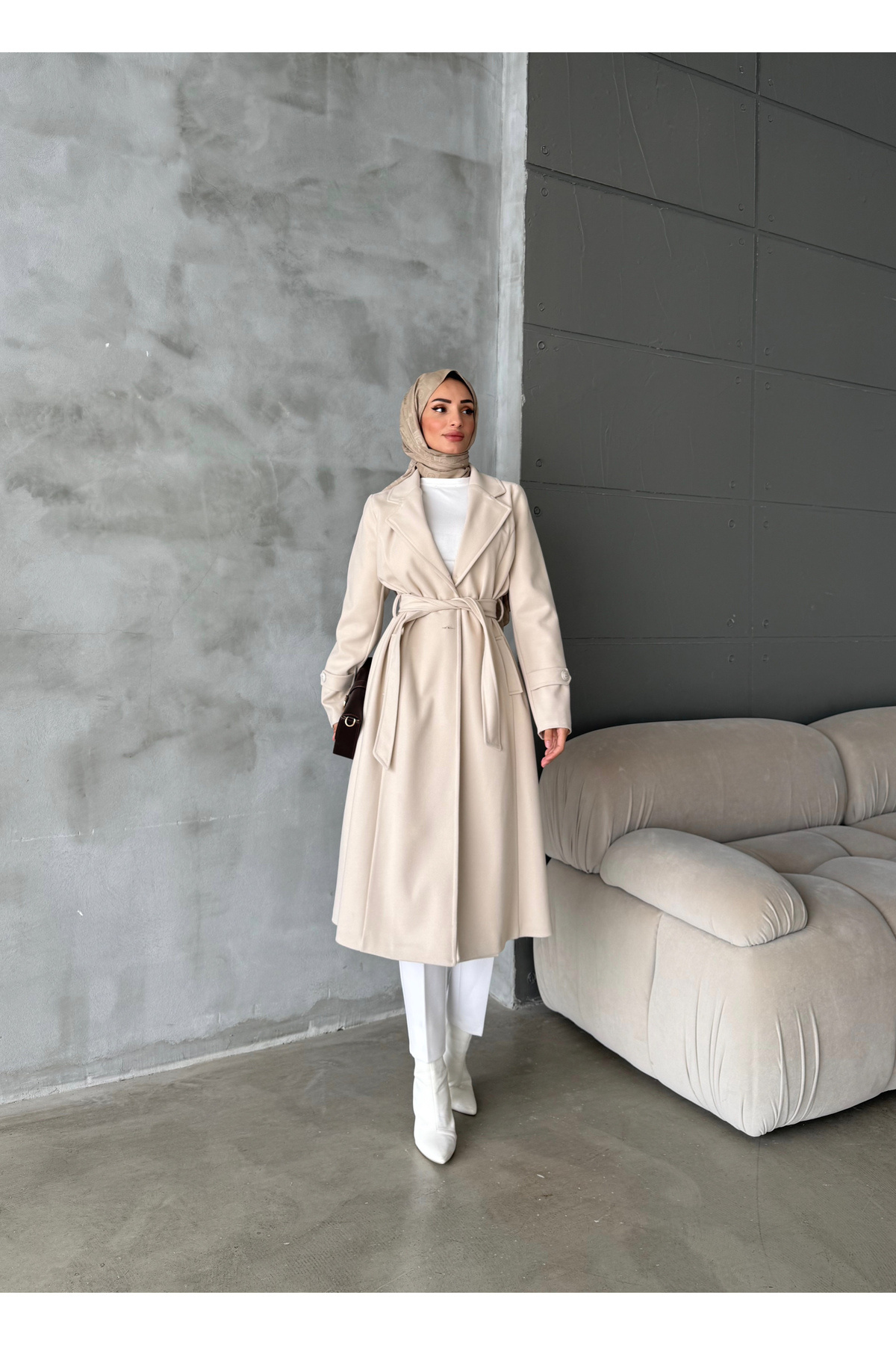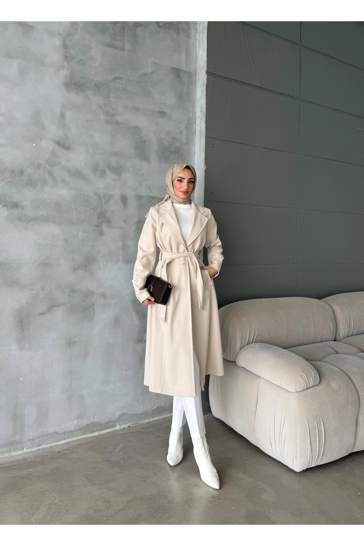 Kadın ve genç kızlar için ideal, şık ve modern bir görünüm sunan ara boy tesettür kaşe kaban