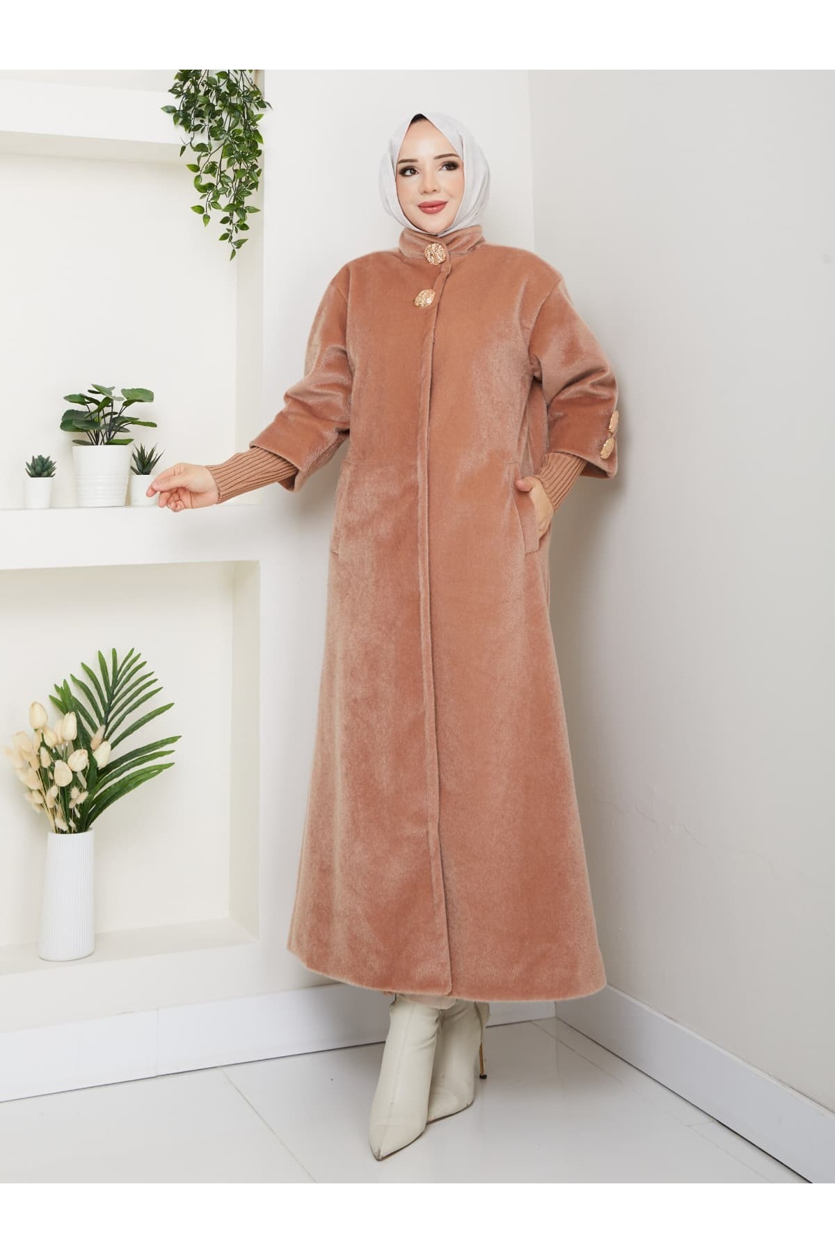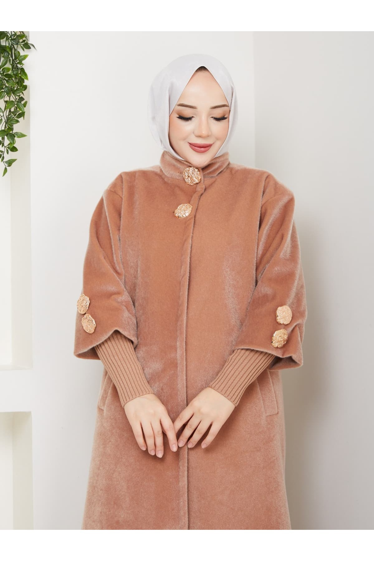 - Kadın ve kızlar için özel olarak tasarlanmış, şık ve modern bir görünüm sunan dik yaka bilek ucu ribanalı gold düğme detaylı foks kumaş kaban/mont.