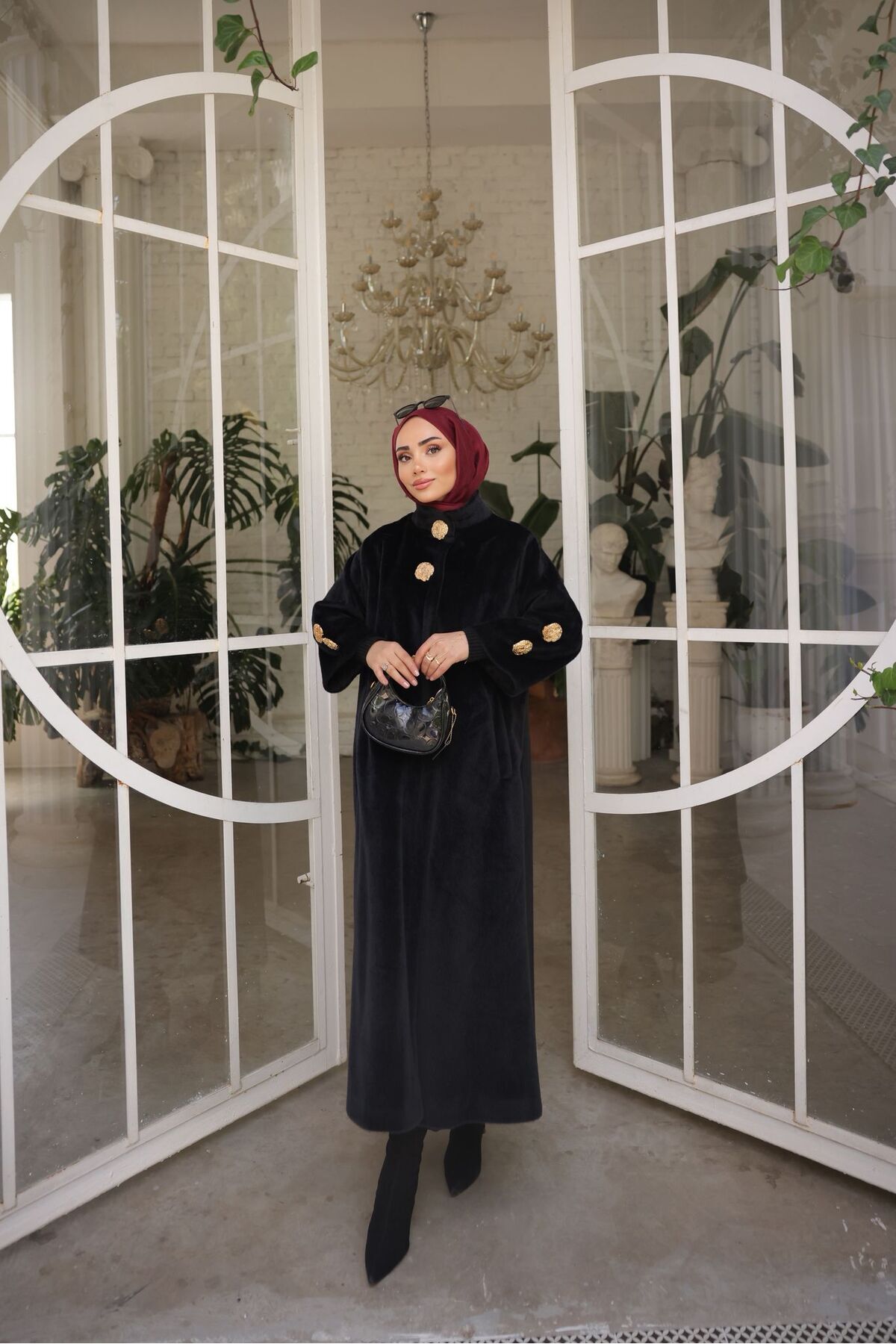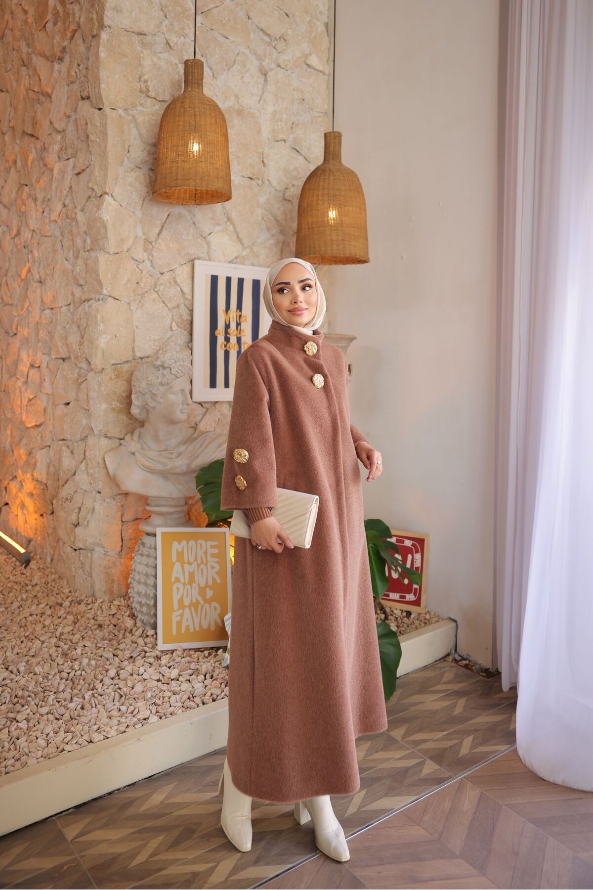 - Kadın ve kızlar için özel olarak tasarlanmış, şık ve modern bir görünüm sunan dik yaka bilek ucu ribanalı gold düğme detaylı foks kumaş kaban/mont.