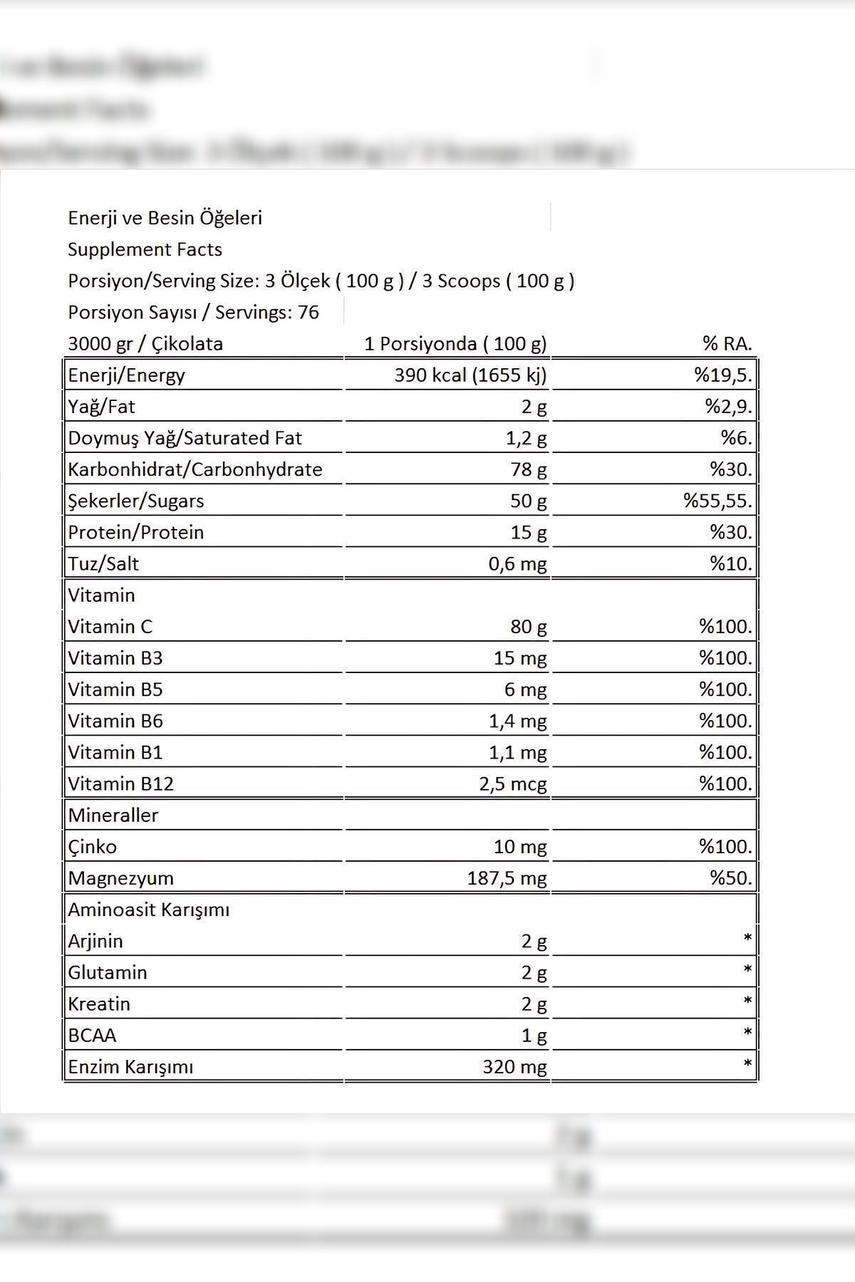 - Whey protein ve kreatin içerikli formülü ile kas gelişimini destekler ve enerji seviyelerini artırır.