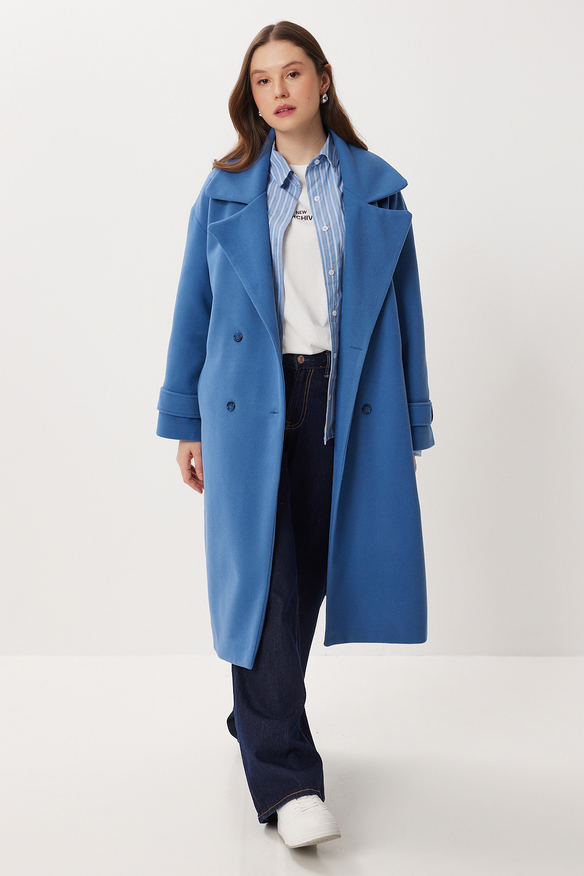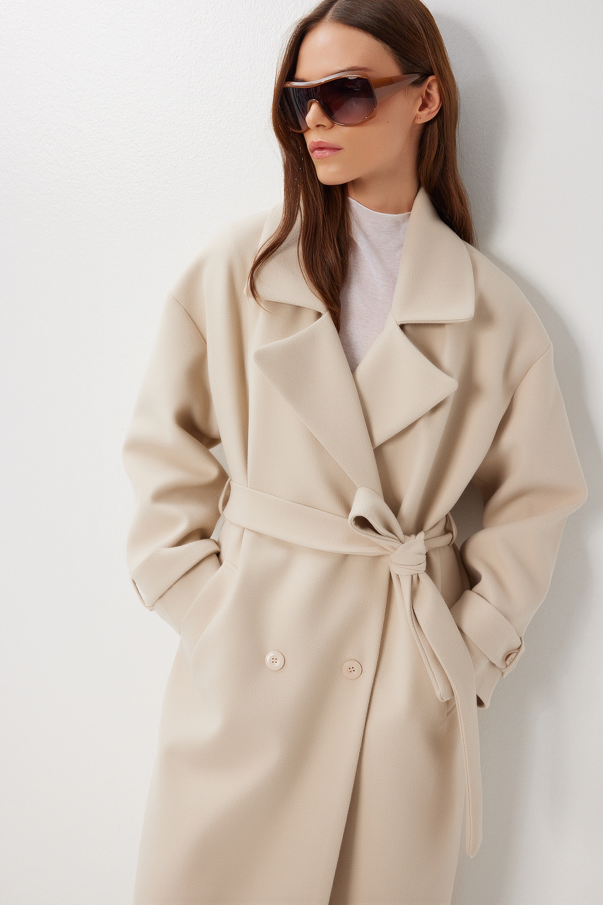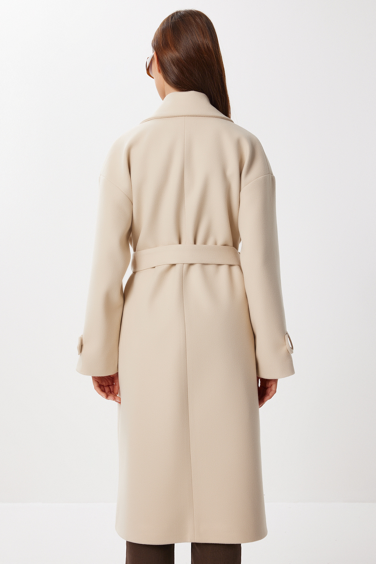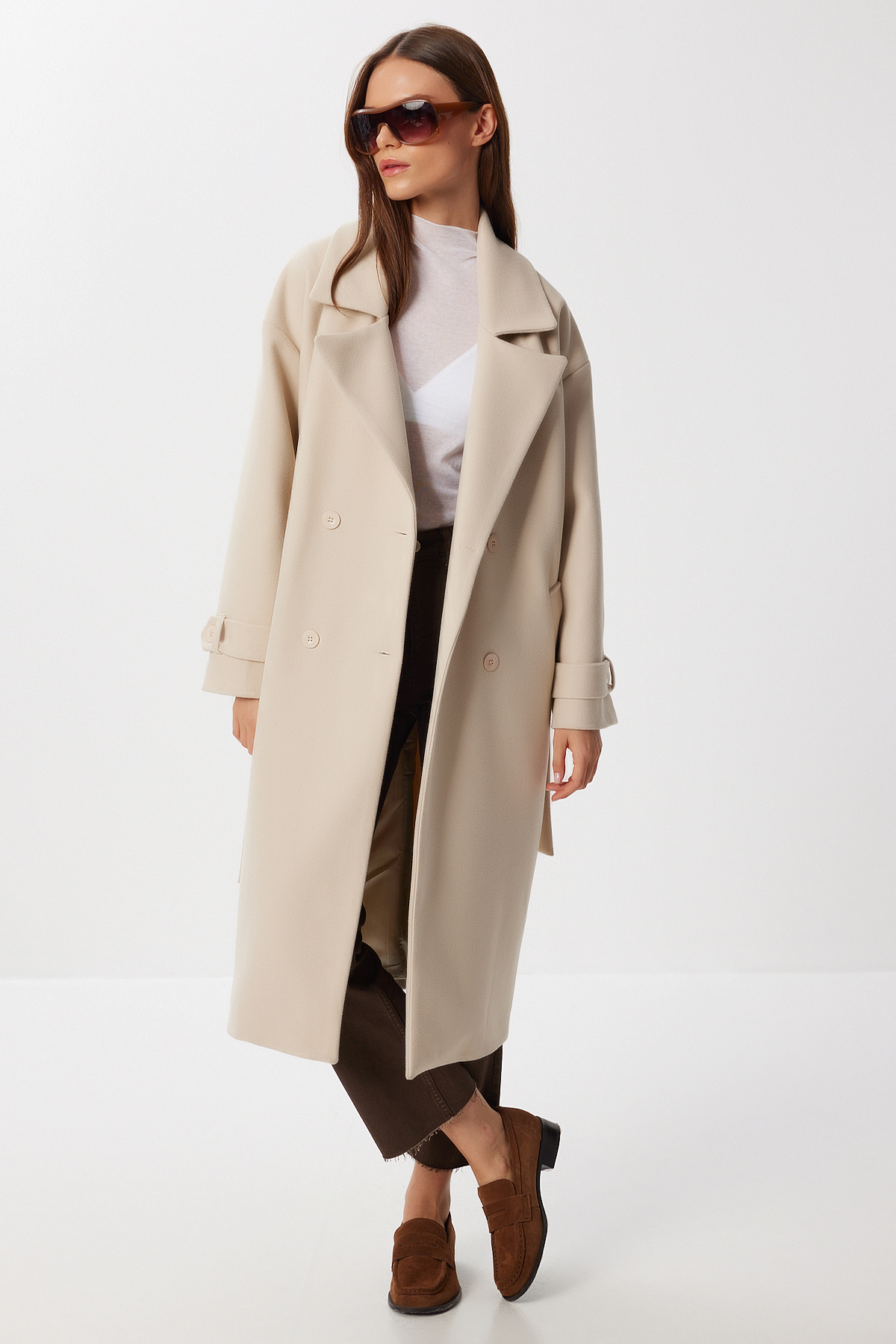 Kruvaze yaka, düğme kapamalı, düşük omuzlu, astarlı, kol ucu düğmeli, yan cepli, kuşaklı kaşe kabanİçerik: %50 Pamuk %47 Polyester %3 ElastanÜrün Boyu: 114 cm Kol Boyu: 51 cm Yıkamayınız.