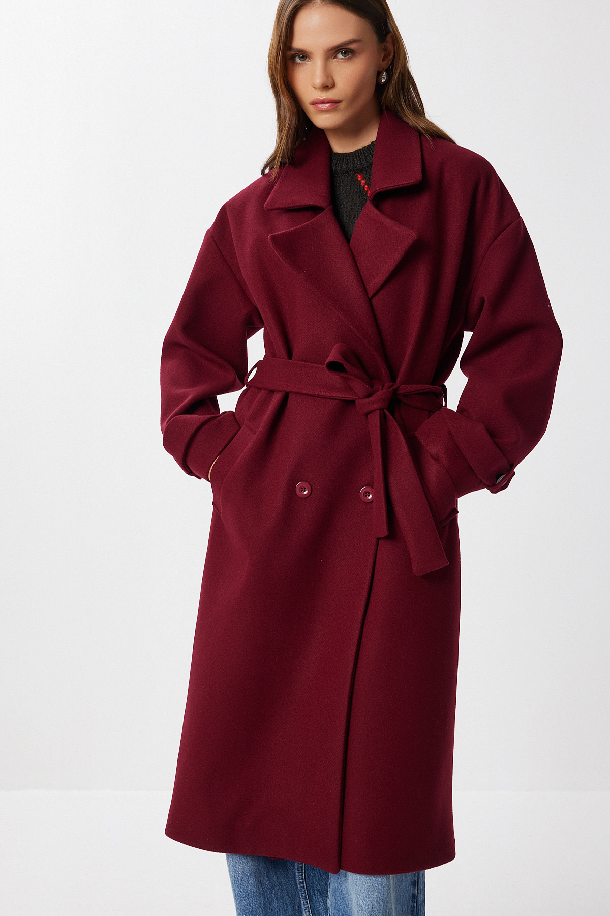Kruvaze yaka, düğme kapamalı, düşük omuzlu, astarlı, kol ucu düğmeli, yan cepli, kuşaklı kaşe kabanİçerik: %50 Pamuk %47 Polyester %3 ElastanÜrün Boyu: 114 cm Kol Boyu: 51 cm Yıkamayınız.