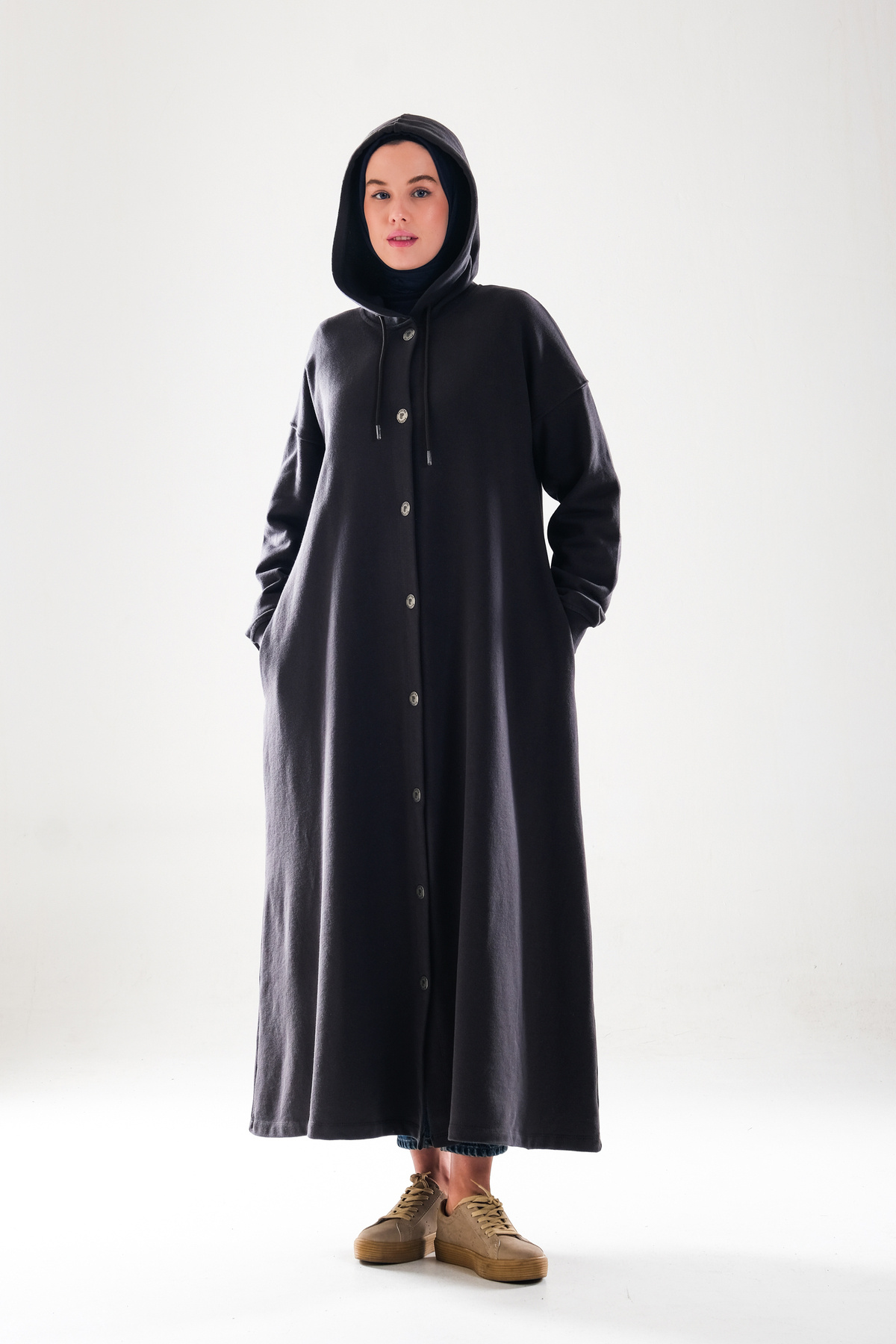 2274_Kadın Antrasit Gri Kapüşonlu Çıtçıtlı 3 İplik Uzun Kap – Oversize Cepli Mevsimlik Tesettür