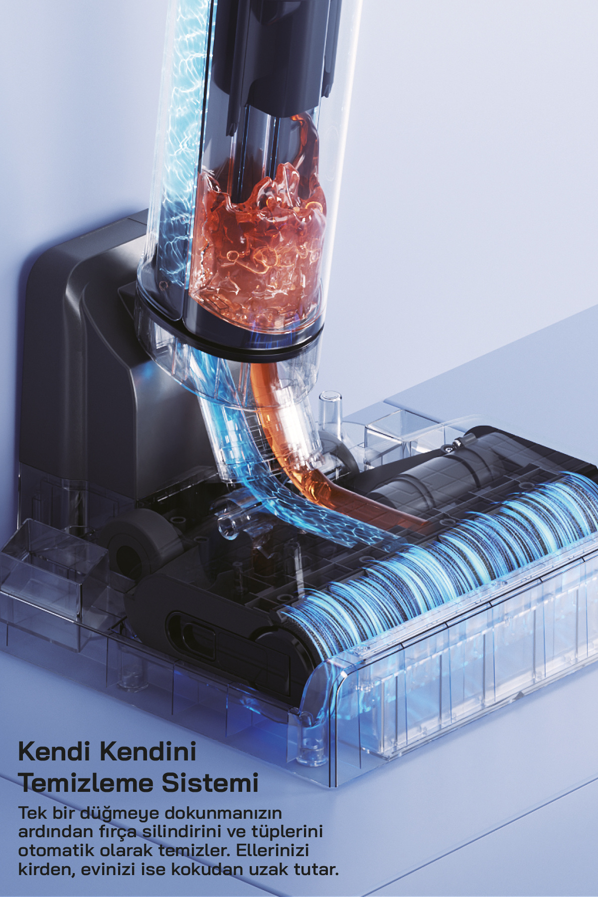 Hem ıslak hem kuru yüzeylerde güçlü temizlik sunan, pratik ve ergonomik bir yardımcıdır. BLDC motor teknolojisi sayesinde yüksek emiş gücüyle kir, toz, saç, sıvı döküntü ve lekeleri kolayca temizler. 800 ml temiz su ve 400 ml kirli su haznesiyle uzun süreli temizlik imkânı sağlar. Kendi kendini temizleme özelliğiyle fırça ve borularda koku oluşumunu engeller. LED ekranı ve sesli asistanı sayesinde kullanım sırasında sizi yönlendirir. Hafif ve kablosuz tasarımı ile dar alanlarda kolay hareket kabiliyeti sunar. Modern Beyaz tasarımı ile şık ve fonksiyonel bir temizlik çözümüdür.
