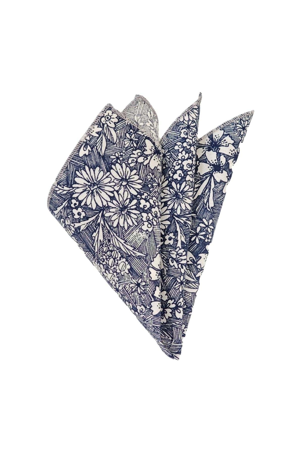 Lacivert üzeri Beyaz Çiçek Desenli Pamuk Baskı Cep Aksesuarı Yaka Mendili