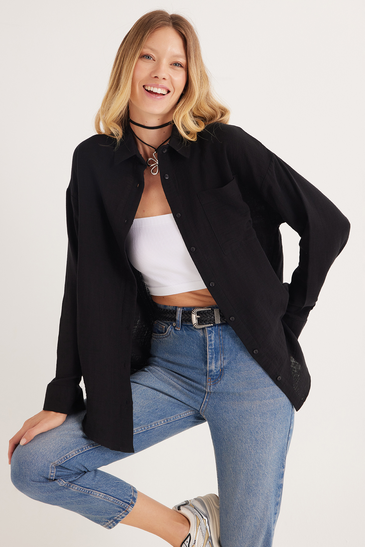 Kadın Oversize Geniş Kesim %100 Pamuk Müslin Kumaş Uzun Kollu Cepli Dokulu Haki Gömlek