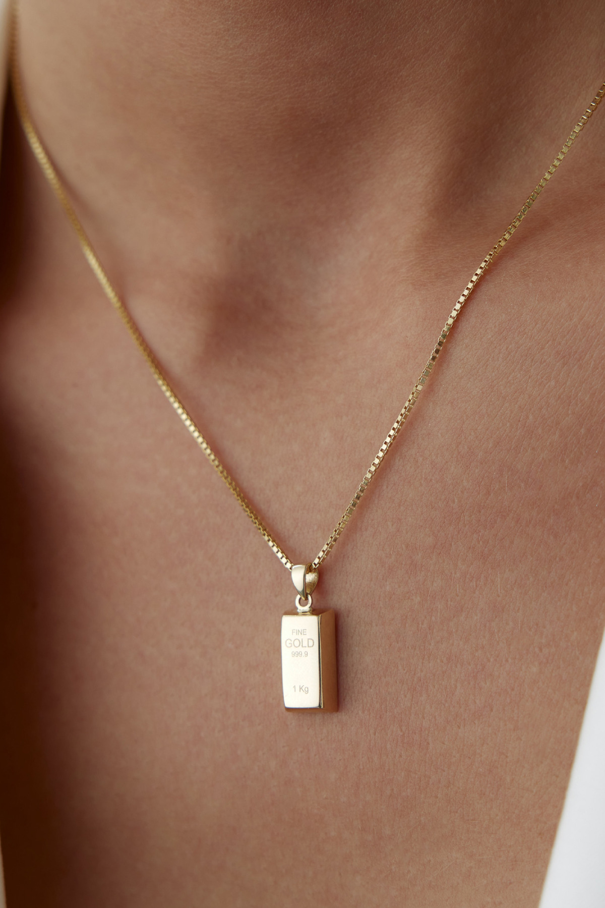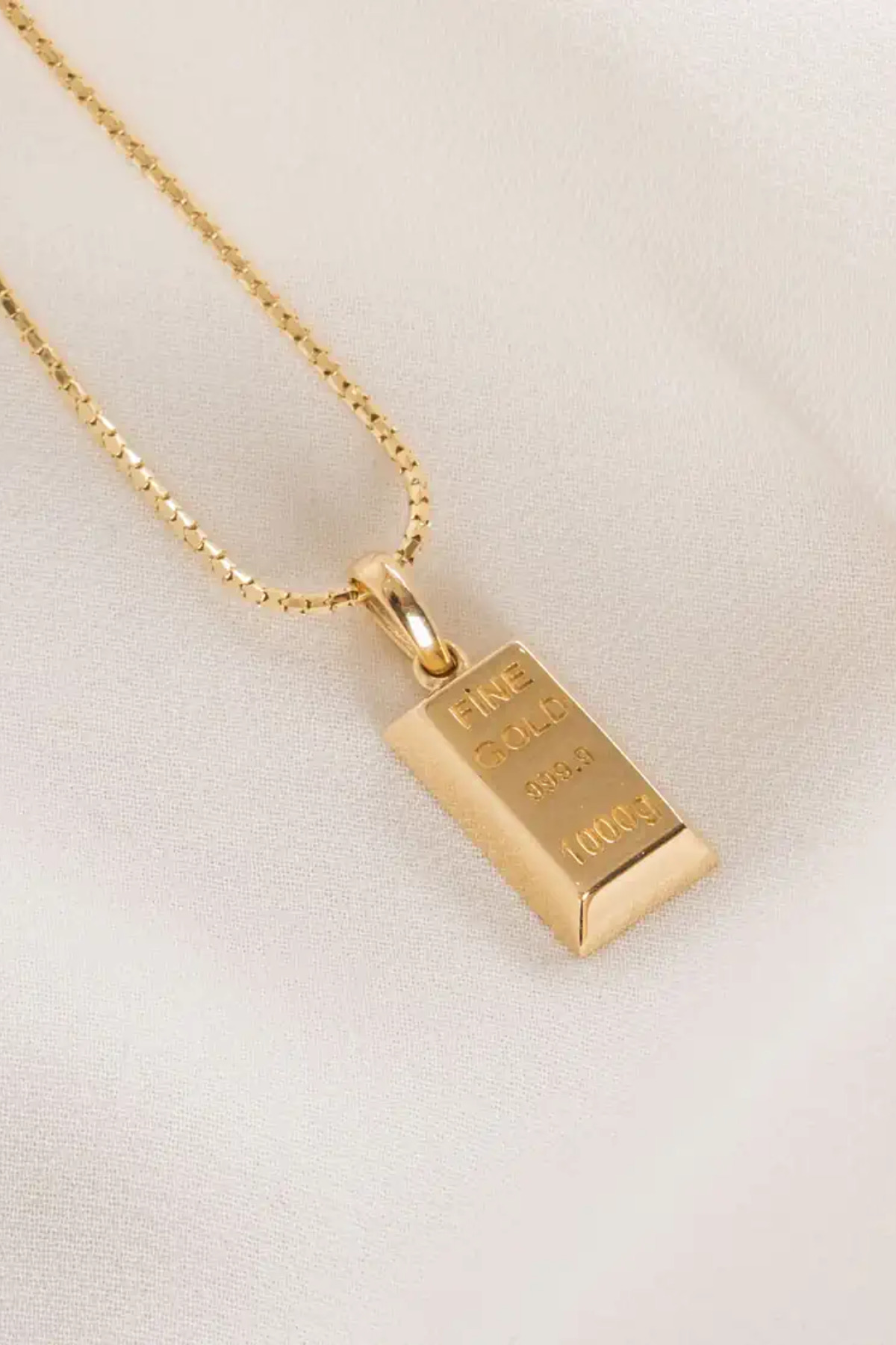 Külçe Altınlı Kolye, kombininizi tamamlayabileceğiniz zarif ve şık bir model.
