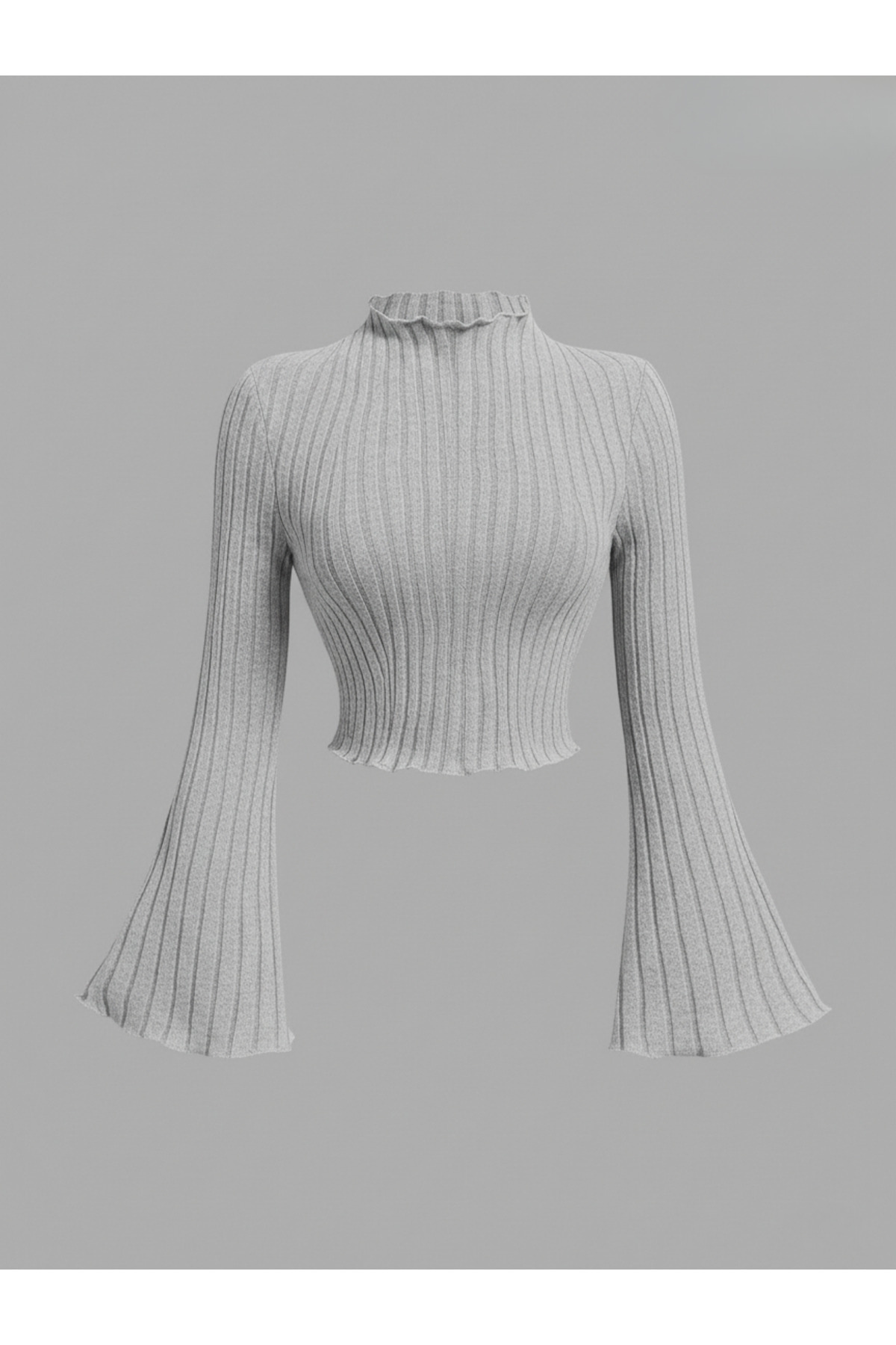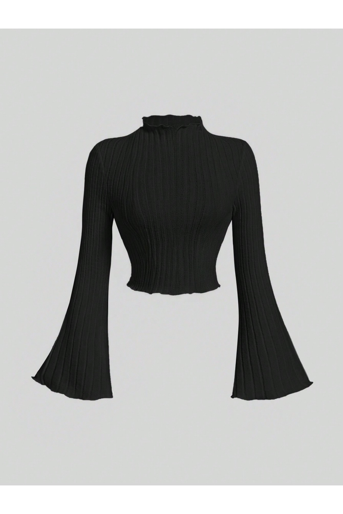 Siyah Fitilli Triko Bluz Uzun Kollu, Volan Kol, Dik Yaka Crop Üst