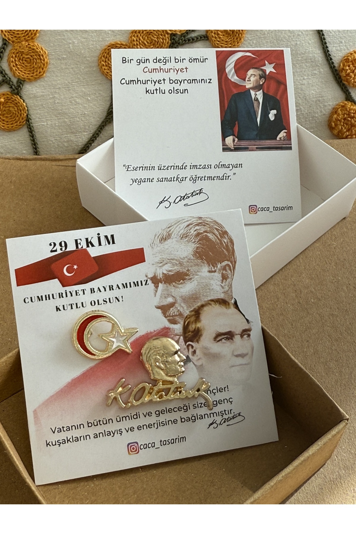 - Atatürk ve ay yıldız figürleriyle süslenmiş, 2'li set olarak sunulan yaka rozeti, 29 Ekim Cumhuriyet Bayramı ve Öğretmen günü kutlamalarınızda şıklığınızı tamamlar.