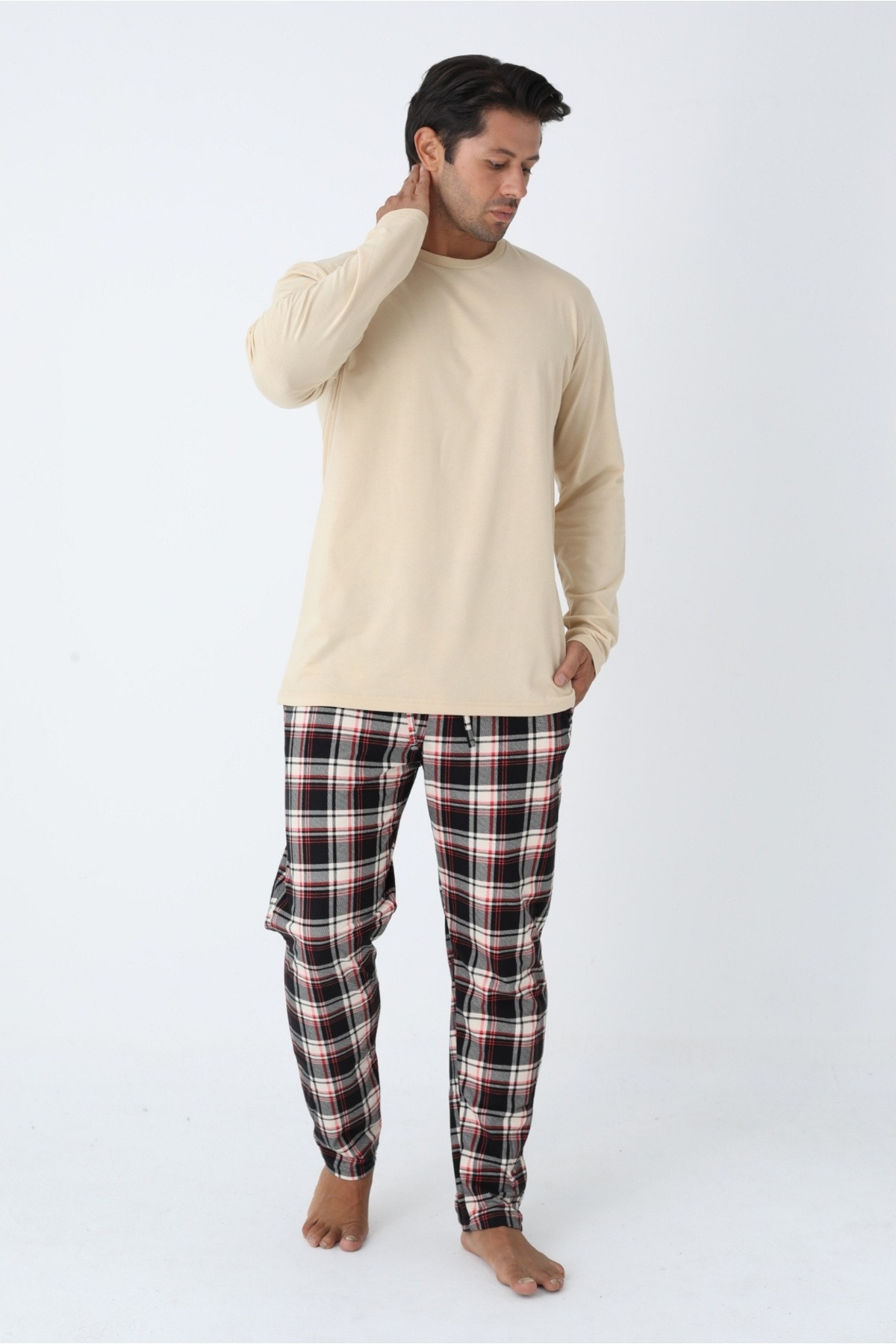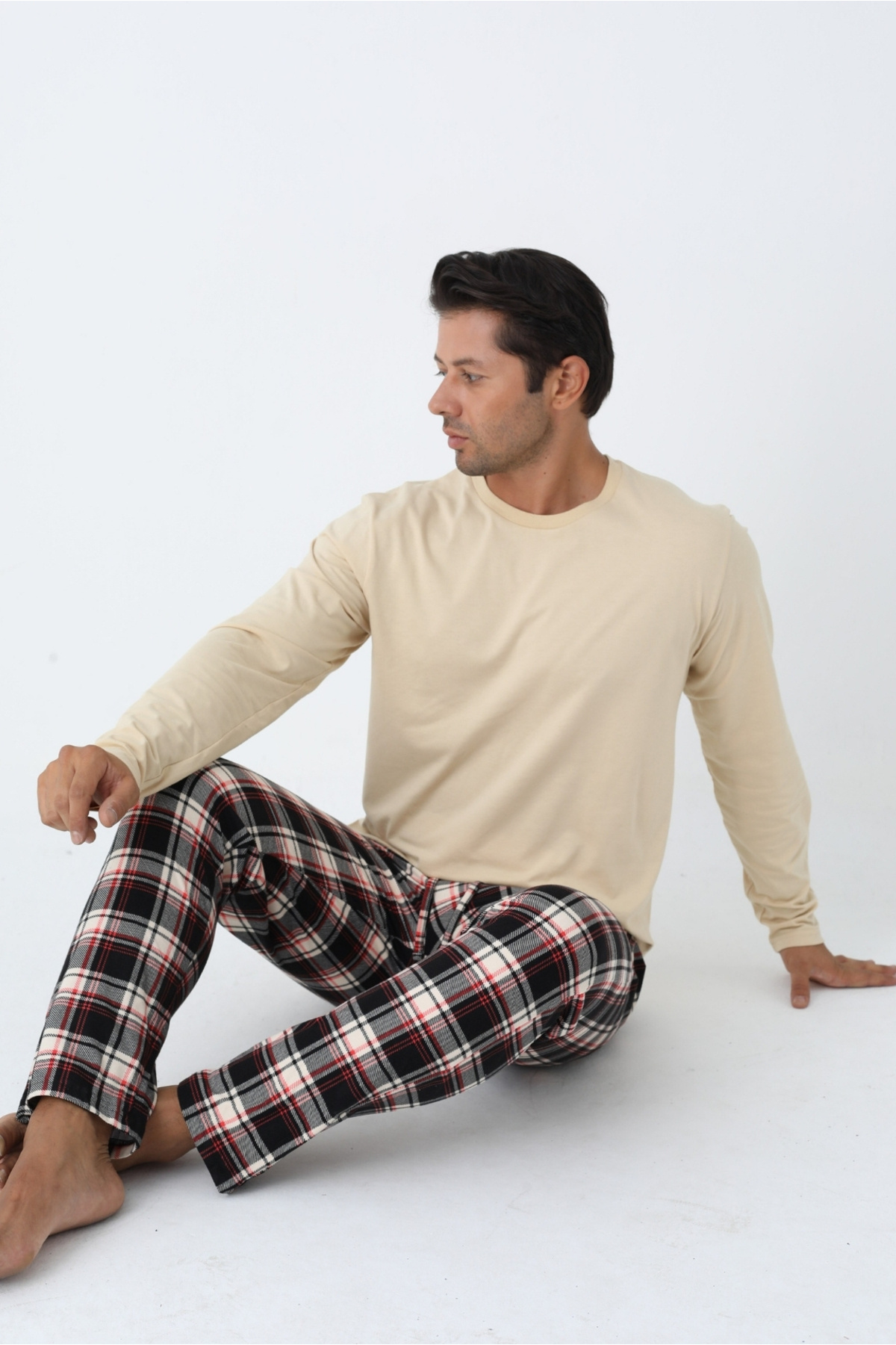 Erkek Bisiklet Yaka Ekose Pijama Takımı – Cep Detaylı, Kordonlu, Gri Melanj / Bej / Beyaz