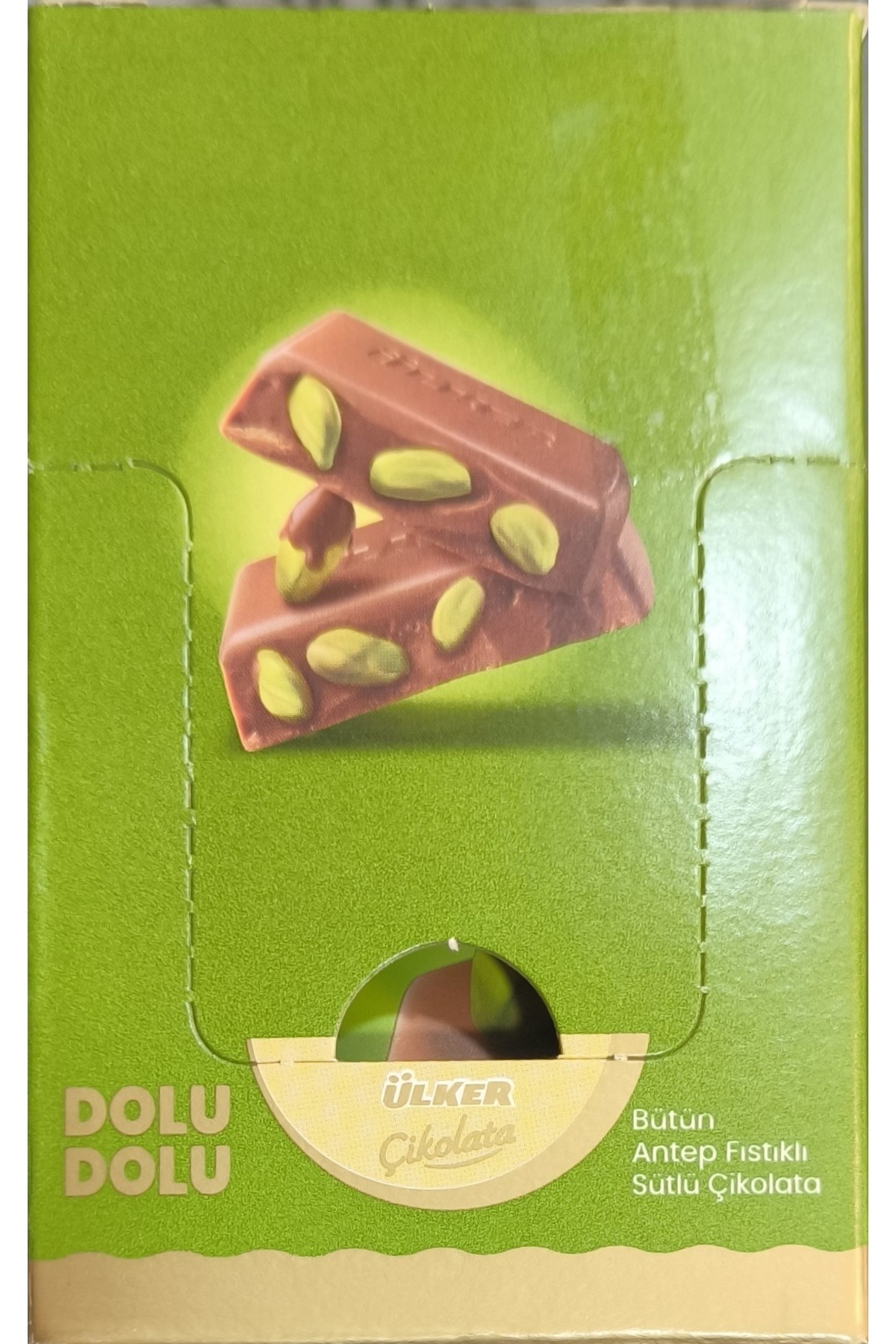 Ülker Dolu Dolu Sütlü Bütün Antep Fıstıklı Çikolata - 9'lu Paket (693 gr)Doğunun lüks lezzeti Antep fıstığı, şimdi Ülker'in kremalı sütlü çikolatasında! Ülker Dolu Dolu Sütlü Bütün Antep Fıstıklı Çikolata, her biri 77 gramlık 9 ayrı paketle toplam 693 gram lezzet sunar.