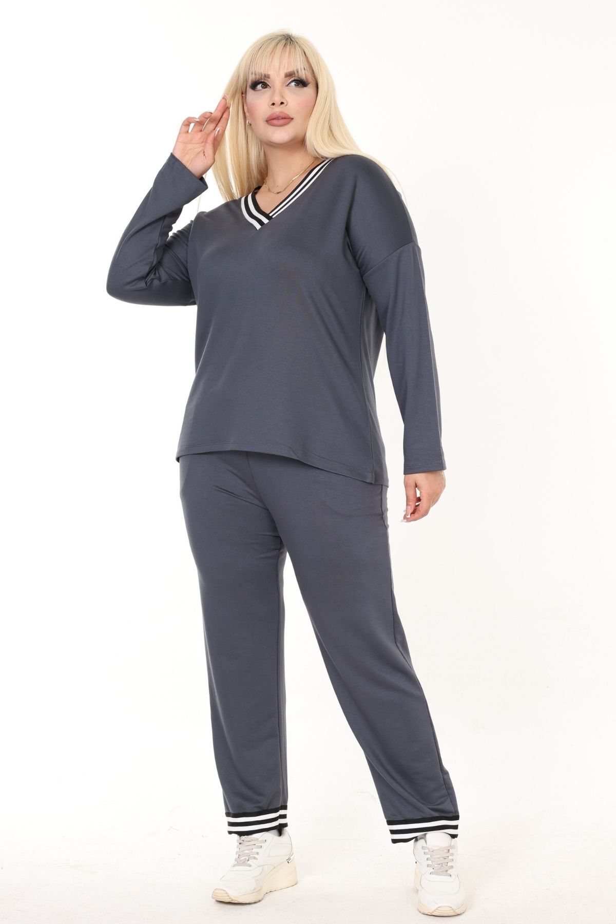 - Antrasit rengiyle şıklığı ve rahatlığı bir arada sunan büyük beden eşofman takımı, günlük kullanım için idealdir.