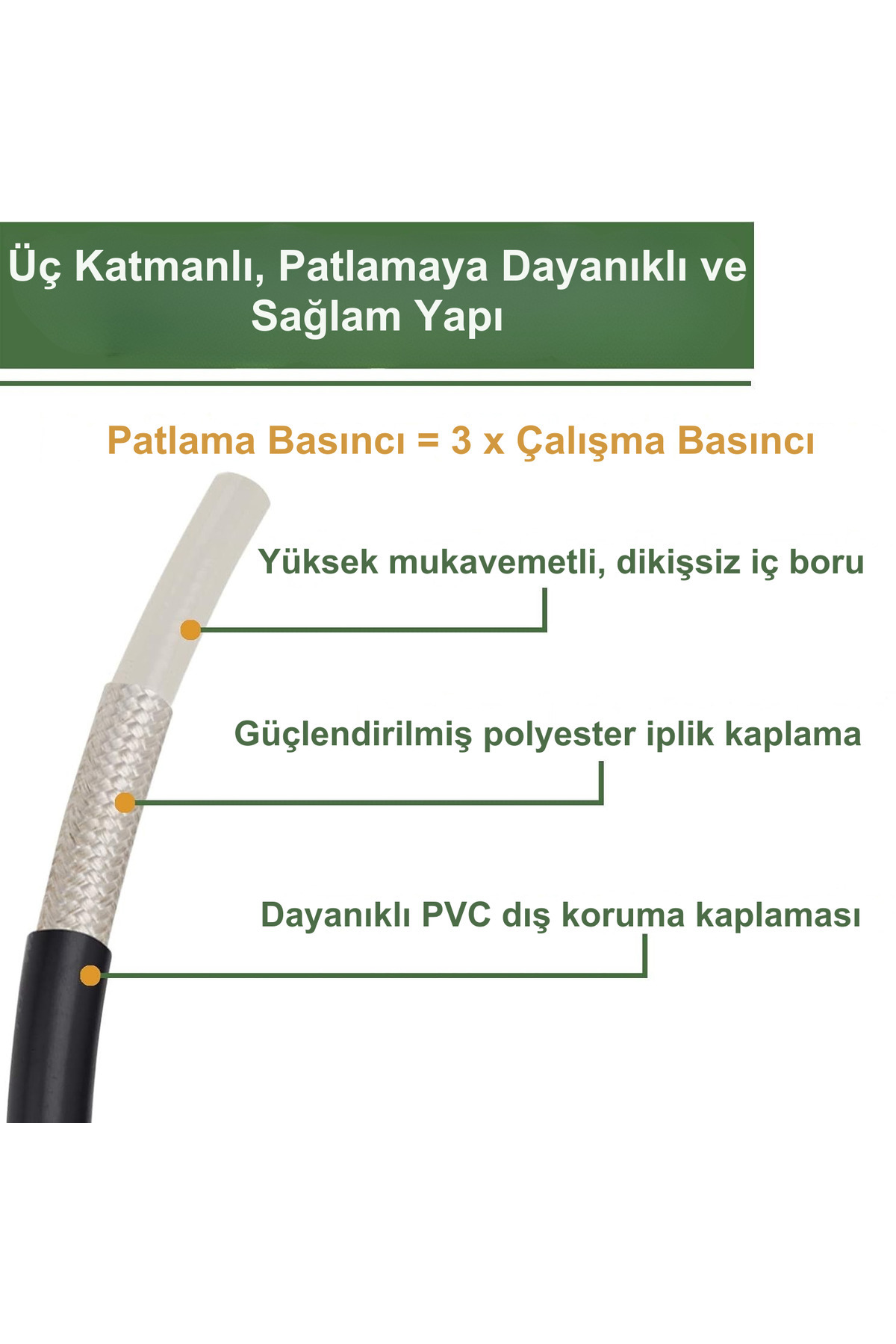 Dayanıklı termoplastik malzemeden üretilmiş pürüzsüz dış kaplama, tekstil örgülü takviye ile güçlendirilmiş iç yapı sayesinde hortum, aşınmaya, bükülmeye ve sürtünmelere karşı maksimum direnç gösterir.