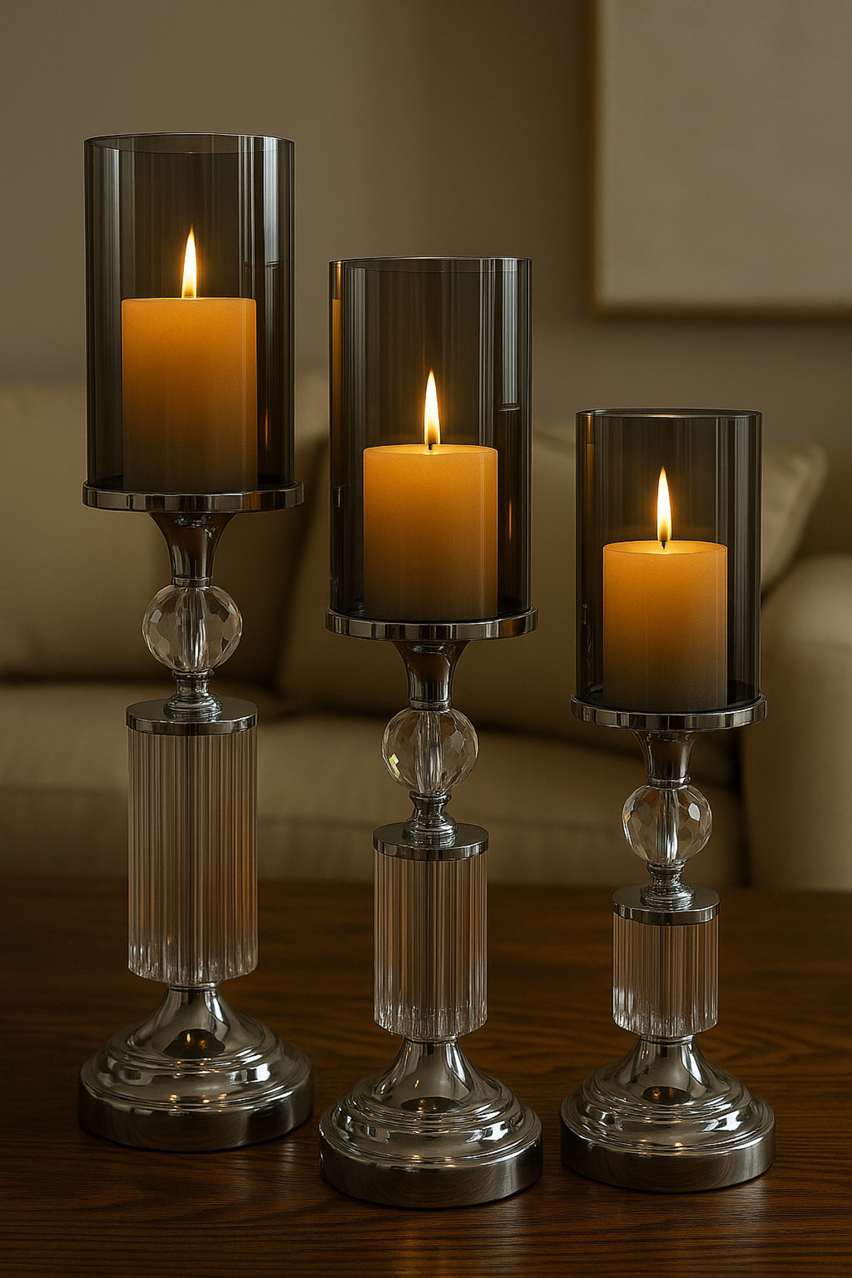 Modern tasarımlı gümüş cam şamdan seti, ev dekorasyonuna sofistike ve şık bir dokunuş katmak isteyenler için mükemmel bir seçimdir.