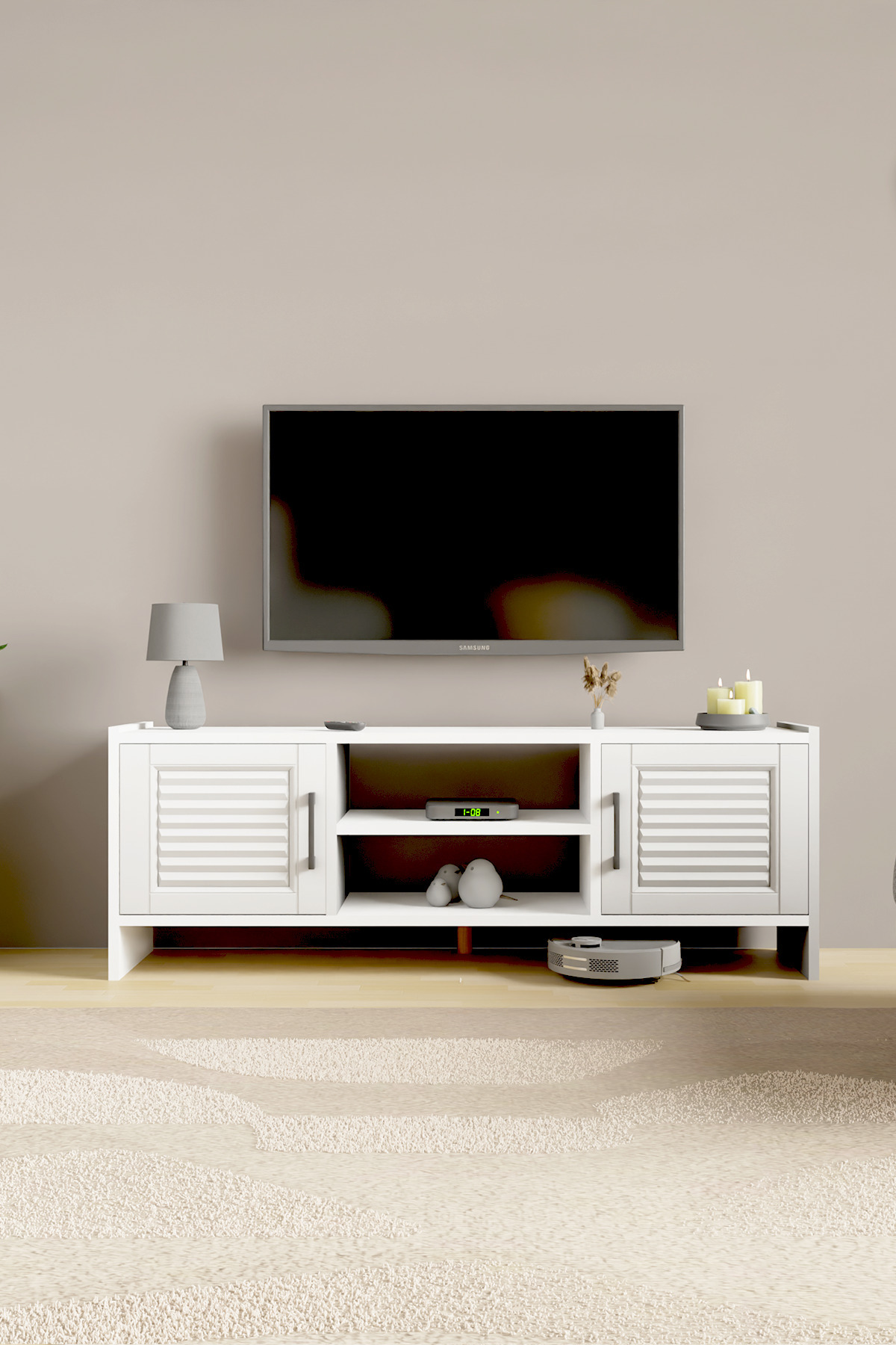 - Raflı yapısı ile hem televizyonunuzu hem de aksesuarlarınızı düzenli bir şekilde sergilemenize olanak tanır.