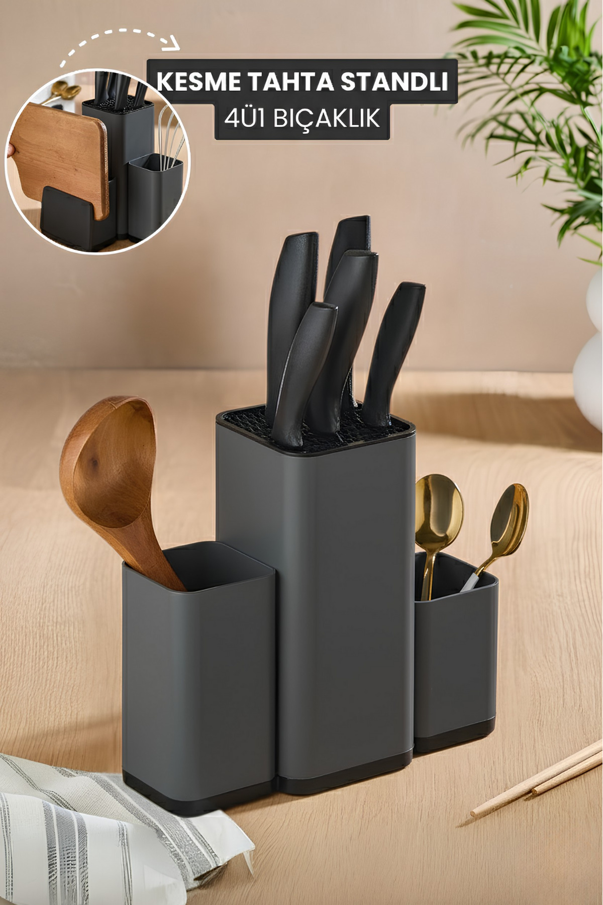 4Ü1 Bıçaklık Kaşıklık Kesme Tahta Standlı Mutfak Tezgah Üstü Dik Düzenleyici
