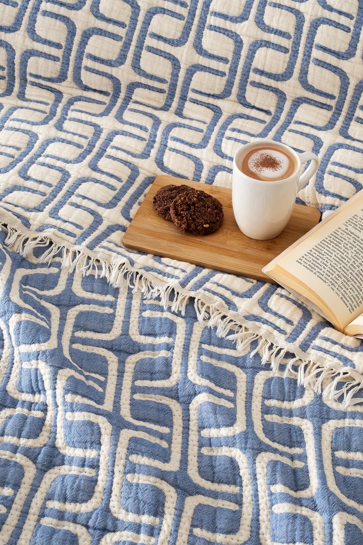 Çift taraflı ve dayanıklı dokusu sayesinde yorgan, battaniye ya da yatak örtüsü olarak pratik biçimde kullanılabilir.