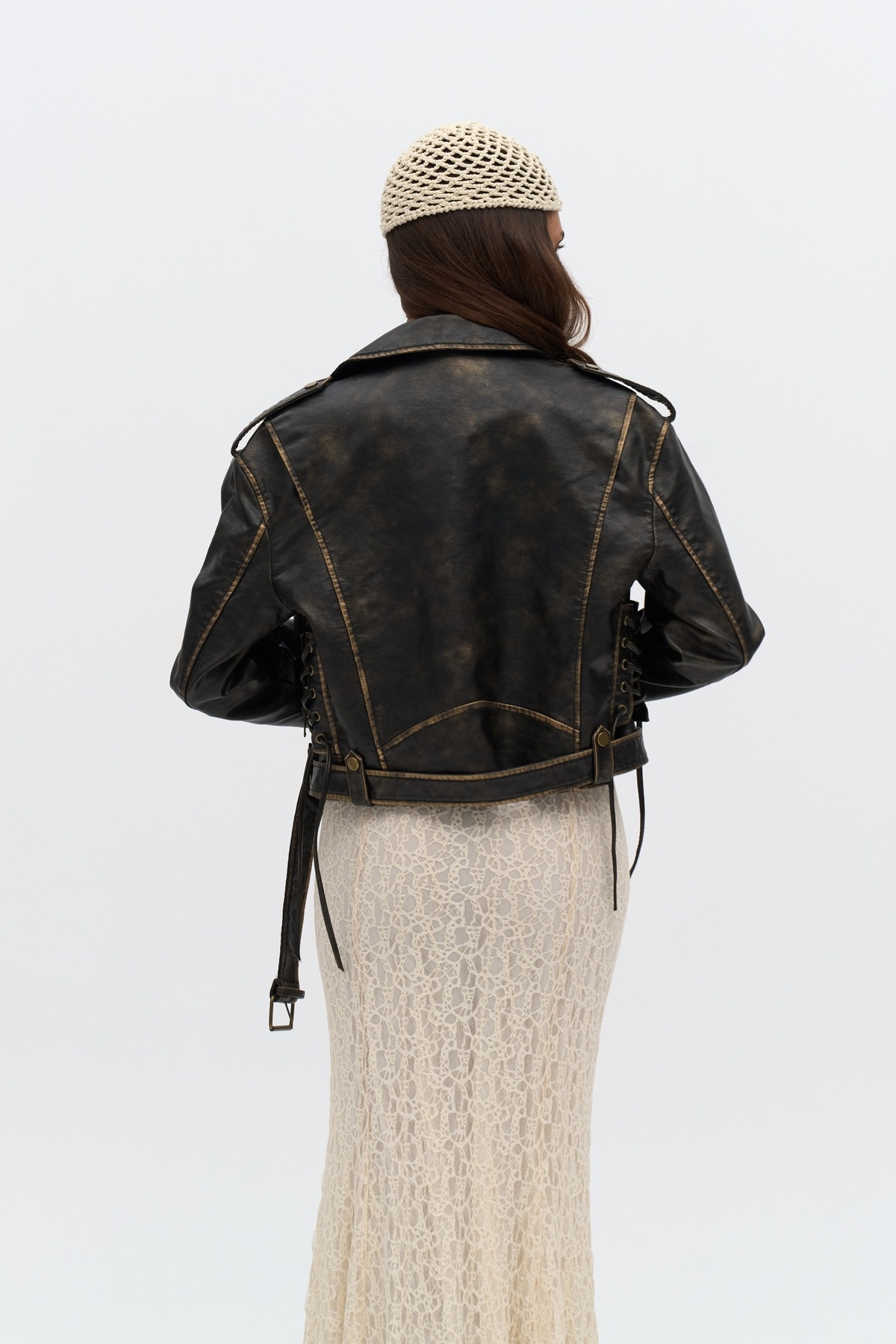 Noor Efektli Koyu Kahve Kısa Suni Deri Ceket