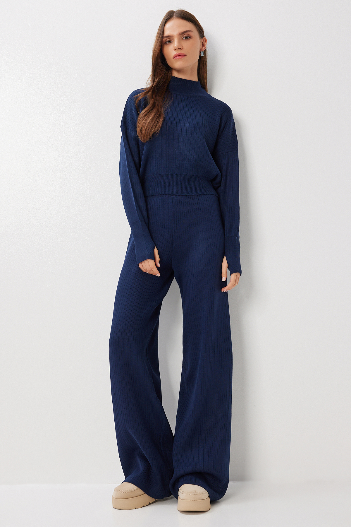 Dik yaka, düşük omuzlu, parmak geçmeli crop kazak ve elastik bel, geniş paça pantolondan oluşan fitilli triko takımİçerik: %100 Akrilik Ürün Boyu: 47 cm Pantolon Boyu: 118 cm30° makinede yıkanabilir.