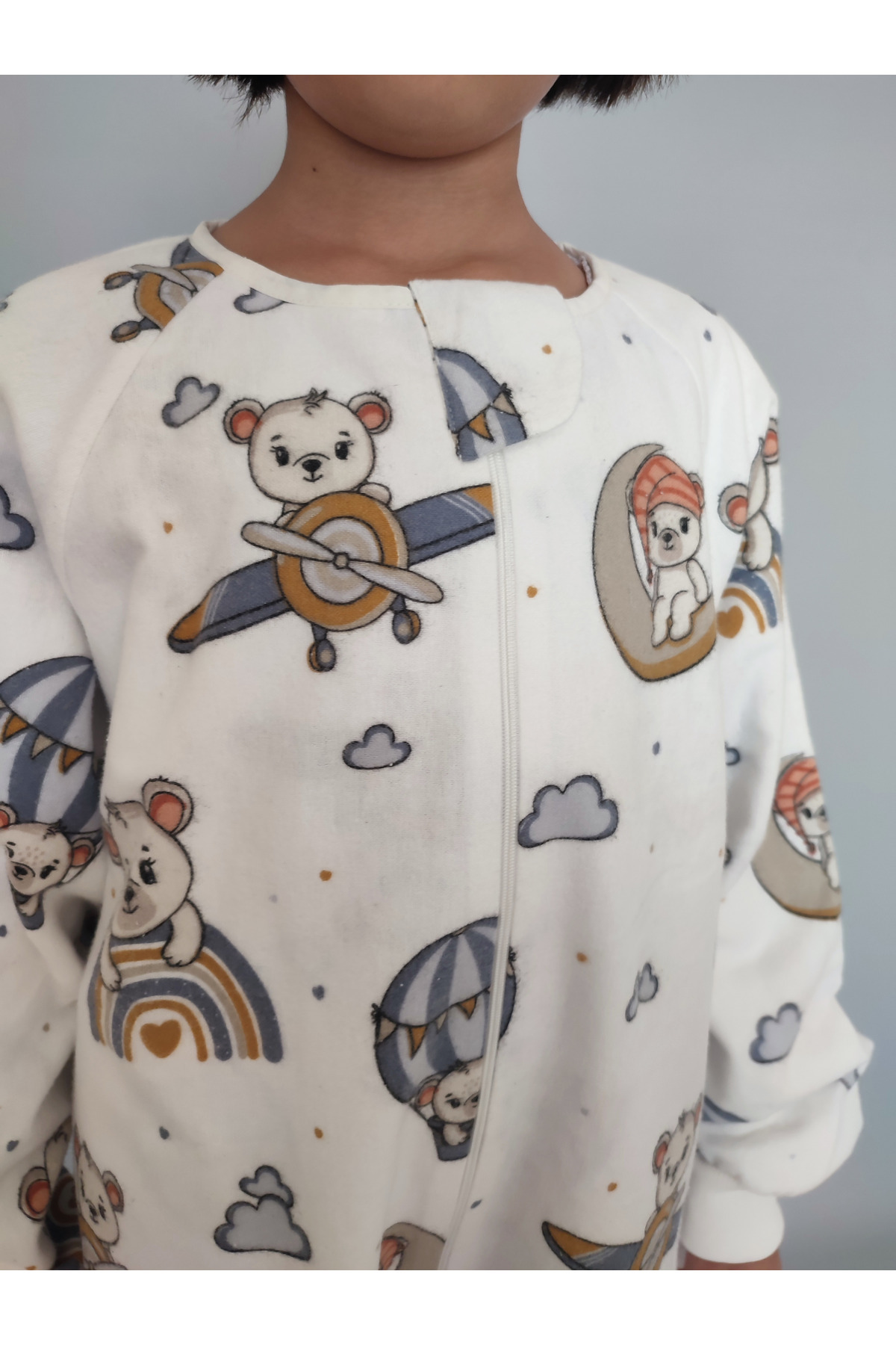 - Uzun kol ve bisiklet yaka tasarımı ile bebeğinizin kollarını sıcak tutarken konforlu bir uyku deneyimi sağlar.
