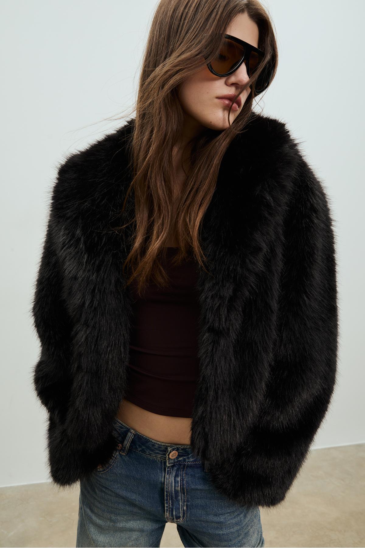 Yumuşak dokunuşlu suni kürk kumaştan yapılmış ceket.