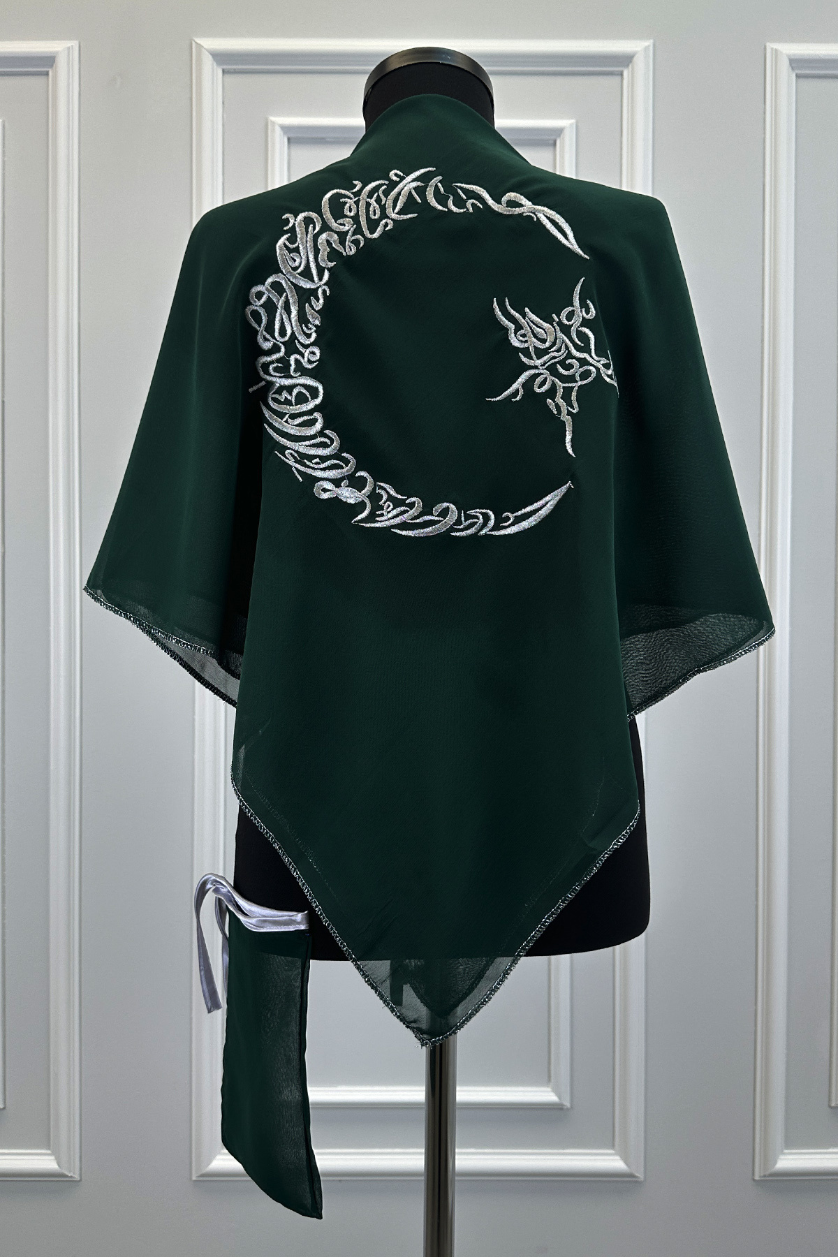 Ürünümüz Birinci Sınıf Kalite Yeşil Şifon Kumaş Olup Gümüş Ayyıldız Desen Nakış İşlemesi ve Kenarları Gümüş Simli Overlok Yapılarak Hazırlanmıştır.