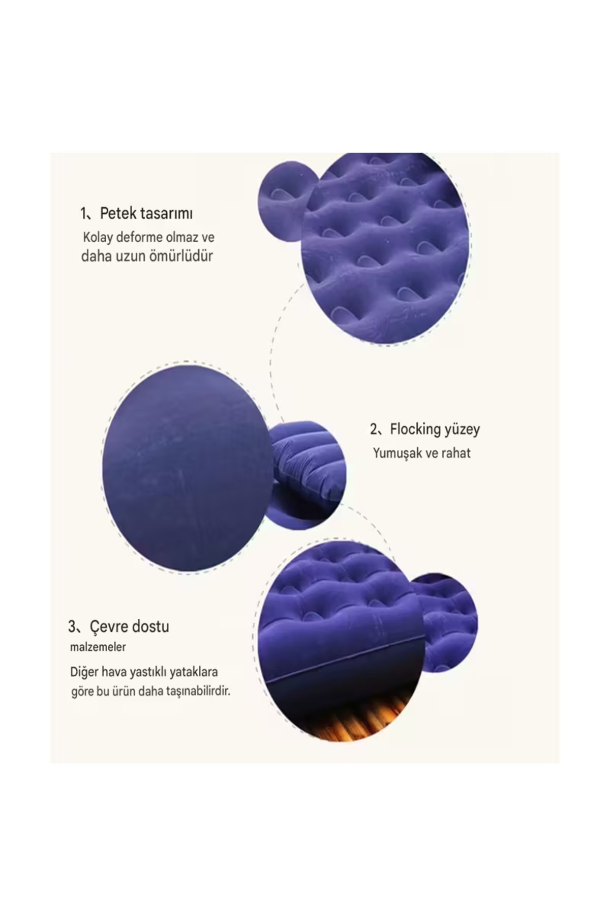 Özellikler: • Boyutlar: 203 x 152 x 22 cm • Yük kapasitesi: 300 kg • Yüzey: Kadifemsi yumuşak, cilt dostu doku • Uygulama: Kamp, ev, araba ve misafirler • İçerik: Hava yatağı, iki şişirilebilir yastık, el pompası