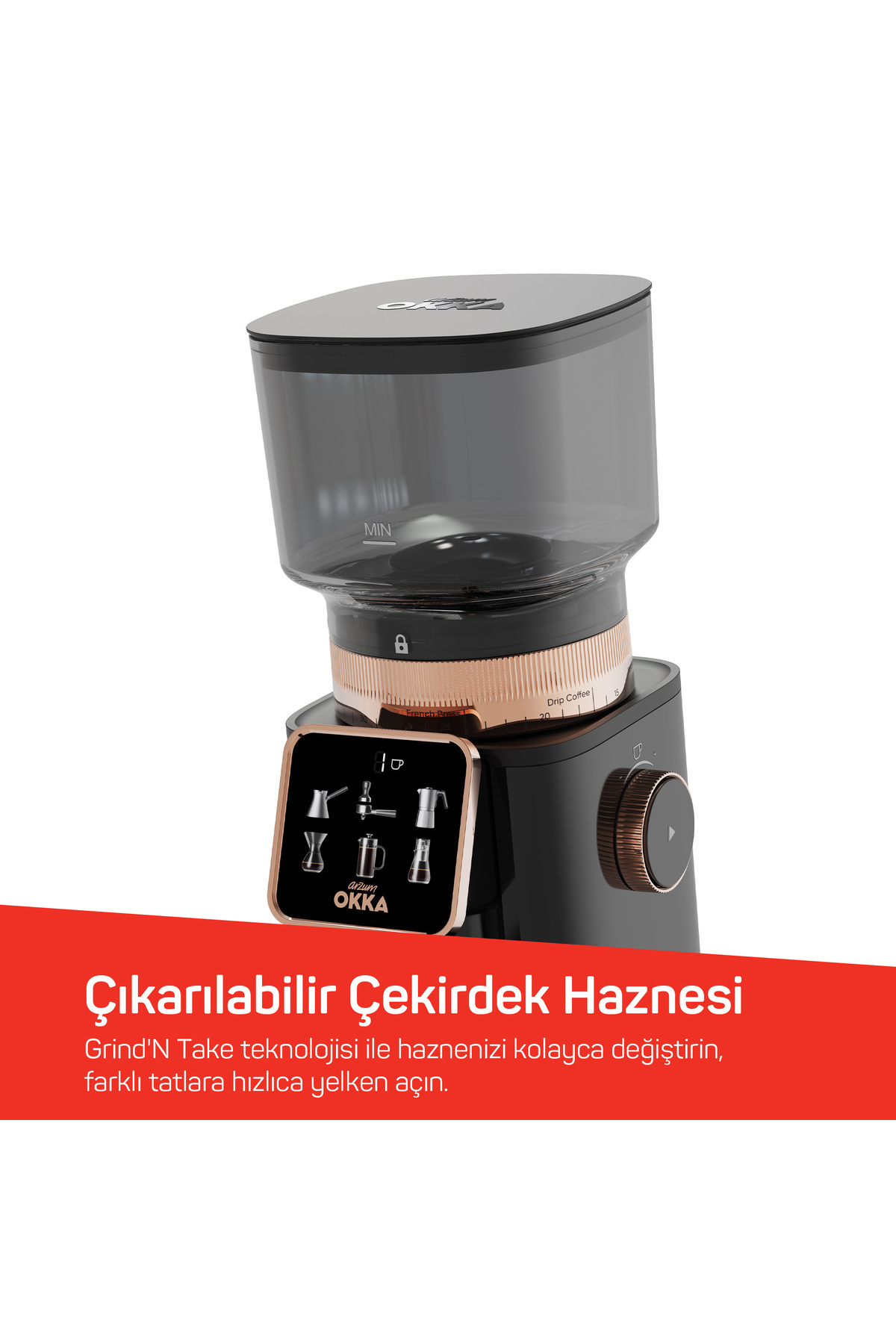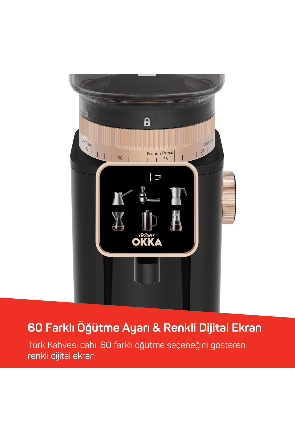 Özel geliştirilmiş öğütme teknolojisi sayesinde en ince öğütme tipi olan “Türk Kahvesi” öğütme özelliği.
