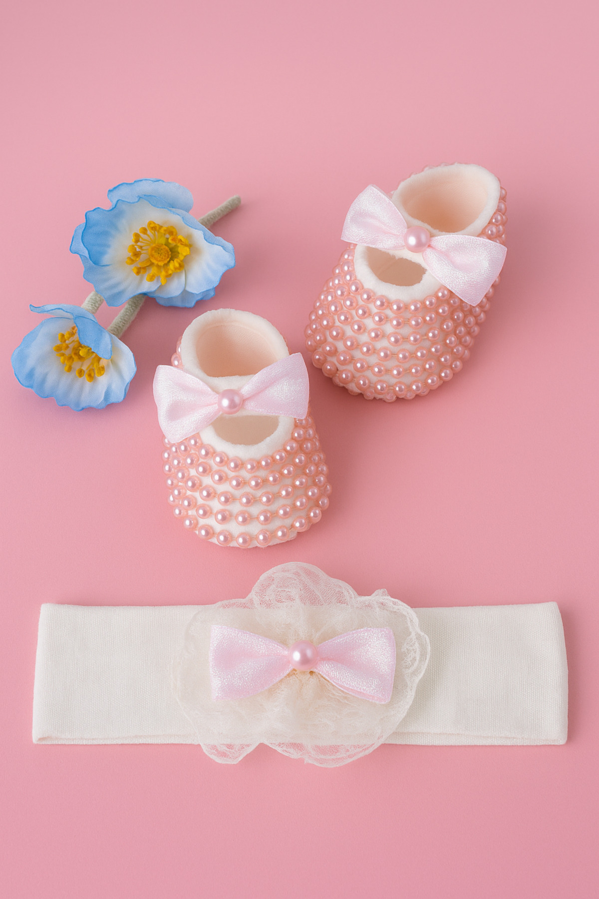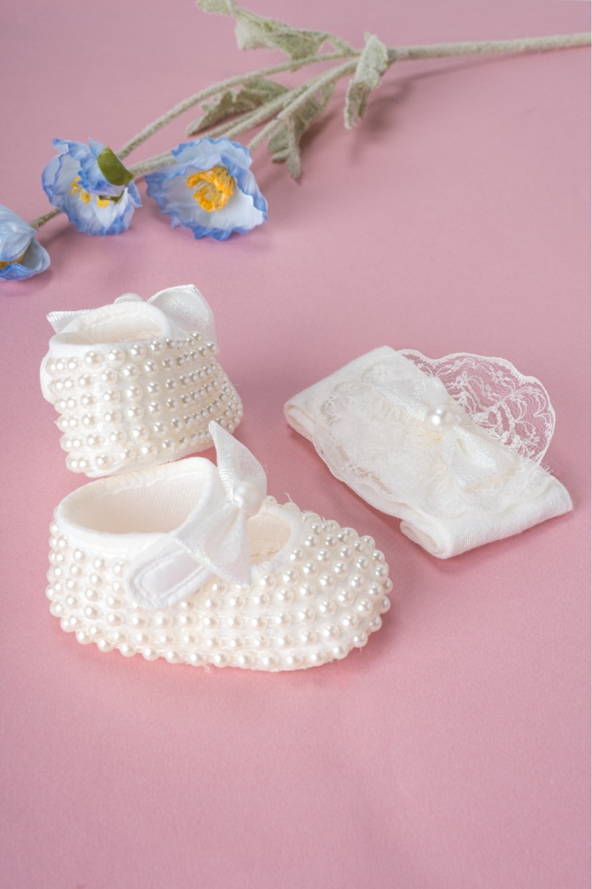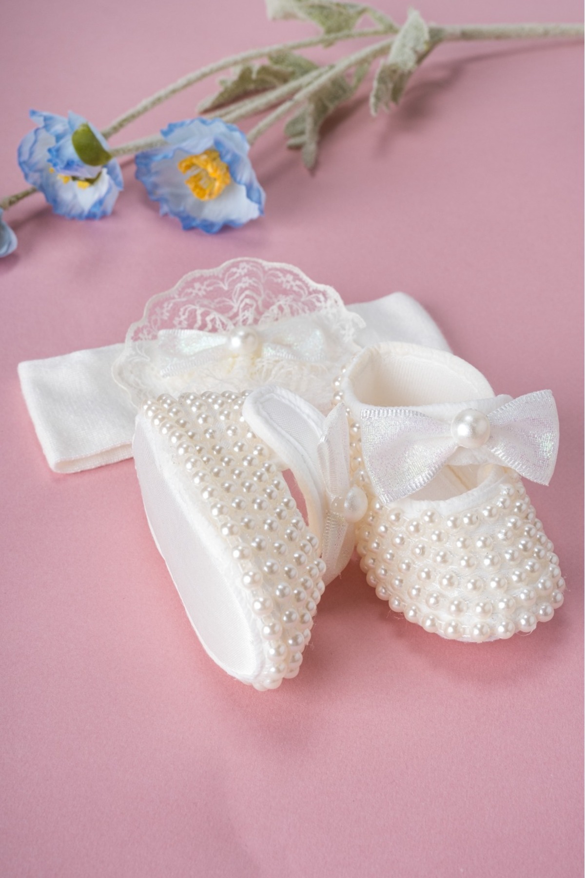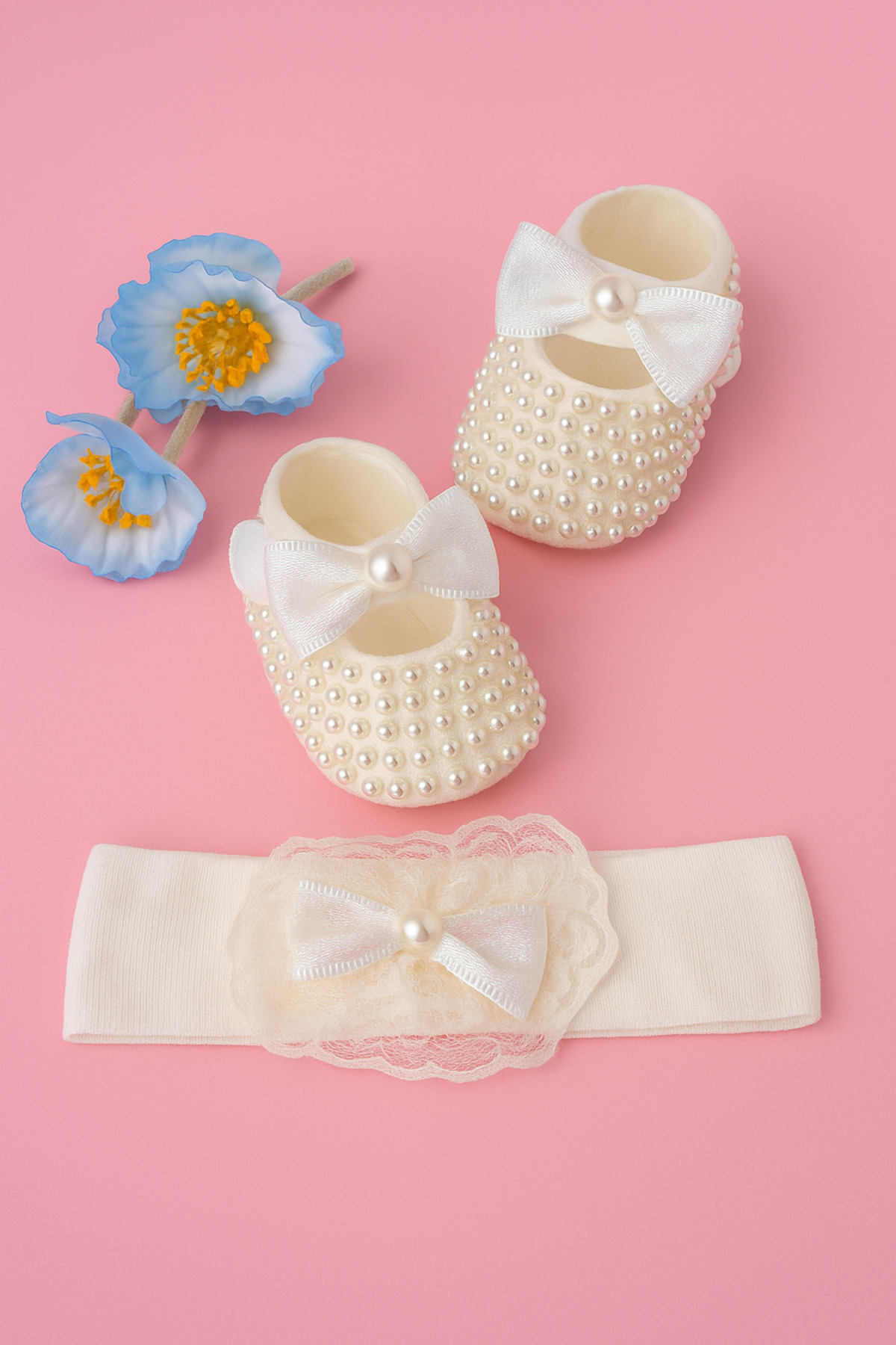 - Kız bebeklerinize özel, fiyonk detaylı parlak incili ayakkabı ve saç bandı seti ile şıklığı bir arada sunun.