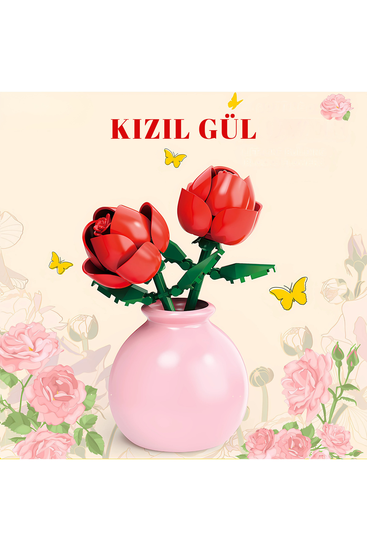 Kızıl Gül Çiçeği Vazolu - Çiçek Model Yapım Seti | Hediyelik & Dekoratif Ürün
