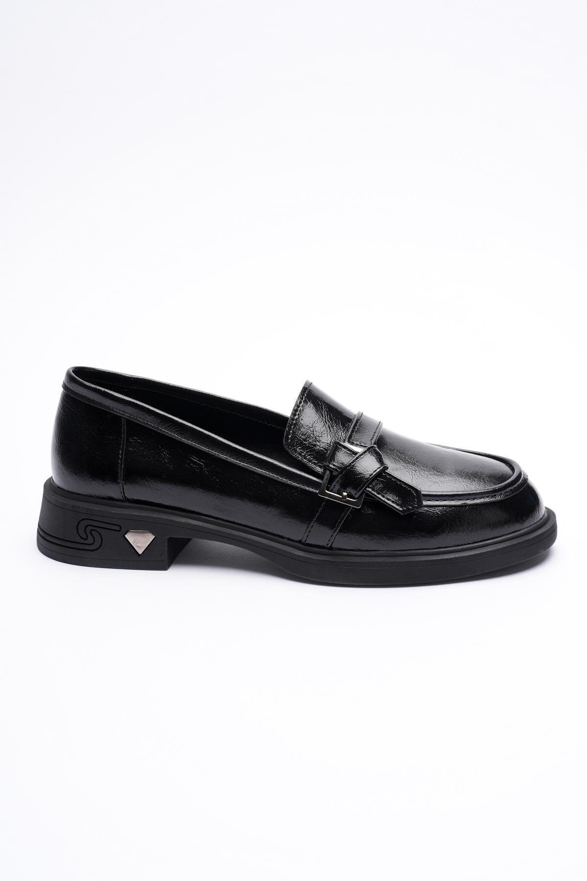 Kadın Rugan Loafer Platin Tokalı Siyah Elor